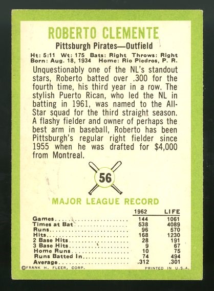 1963 Fleer Roberto Clemente #56 - Here is a card with near perfect centering and great registration.  Corner wear plus a crease on the back makes this one. Good.