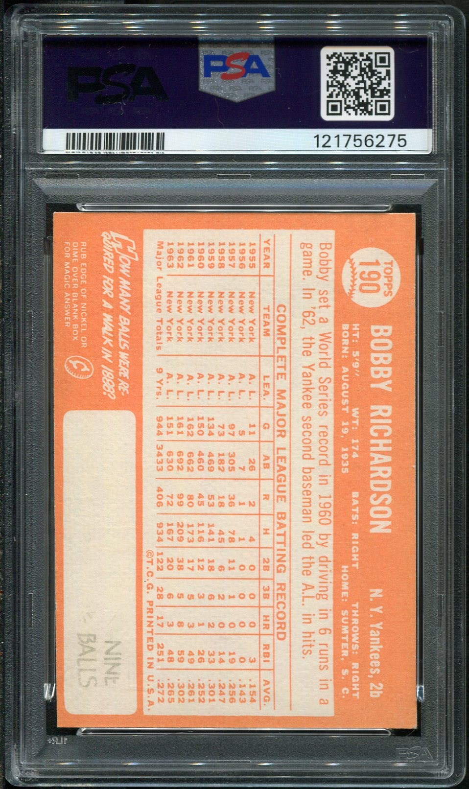 1964 Topps Bobby Richardson #190 PSA NM 7 - Card was recently graded and comes in a new PSA holder. Card has nice centering, sharp corners and great registration.