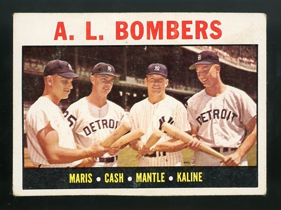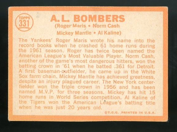 1964 Topps A.L. Bombers #331 (with Mantle, Maris, Kaline, Cash) - Car is very well centered, but does have corner wear and some surface wear that contribute to the VG grade. Card still has nice eye appeal for a low to mid grade set, or for the collector that doesn't want to make a big investment. Starting the minimum bid at just $25.