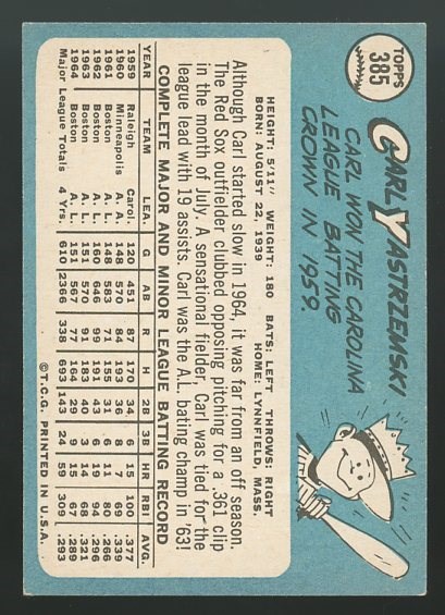 1965 Topps Carl Yastrzemski #385 - A solid mid-grade card free of any major flaws. Card has light corner wear and is a bit off center side to side, while maintaining good eye appeal. Overall grade is EX