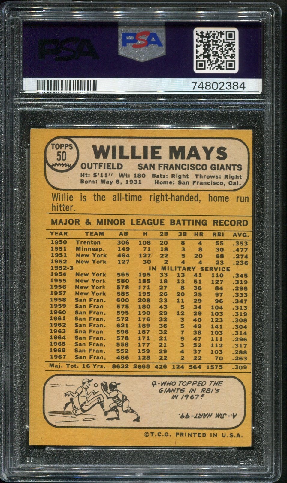1968 Topps Willie Mays #50 PSA NM/MT 8OC - Card is pack fresh with sharp corners and near perfect registration. Centering side to side contributes to the PSA 8OC grade.
