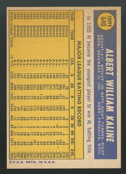 1970 Topps Al Kaline #640 - Card is crease free, but does have some surface wear around his hat and by the Tigers team name. Well centered with EX/MT corners, card likely falls into the EX condition range.