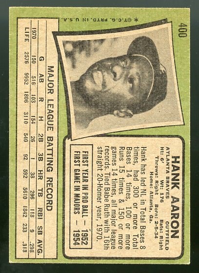 1971 Topps Hank Aaron #400 - A clean mid-grade card with no creases, light corner wear and a bit off center top to bottom. Overall EX condition