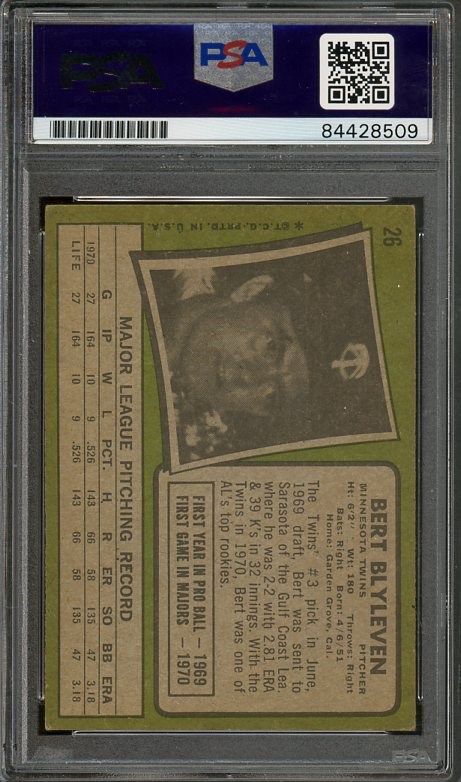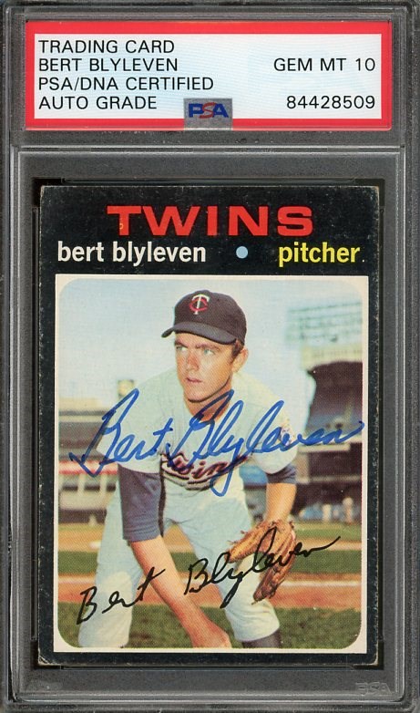 1971 Topps Bert Blyleven RC #26 Autographed with PSA 10 Autograph grade.  Blyleven inked a nice, large, blue sharpie signature across his 1971 Topps rookie.  The autograph really stands out and is deserving of the PSA 10 auto grade.