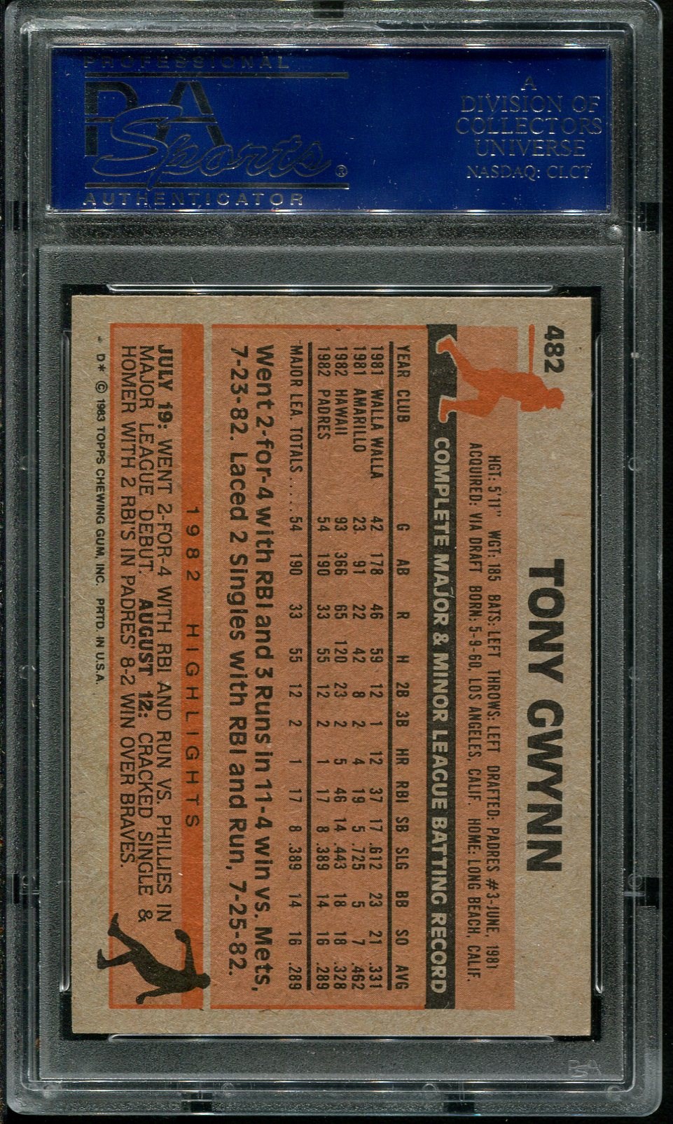 Lot # 188: 1983 Topps Tony Gwynn RC #482 PSA Mint 9