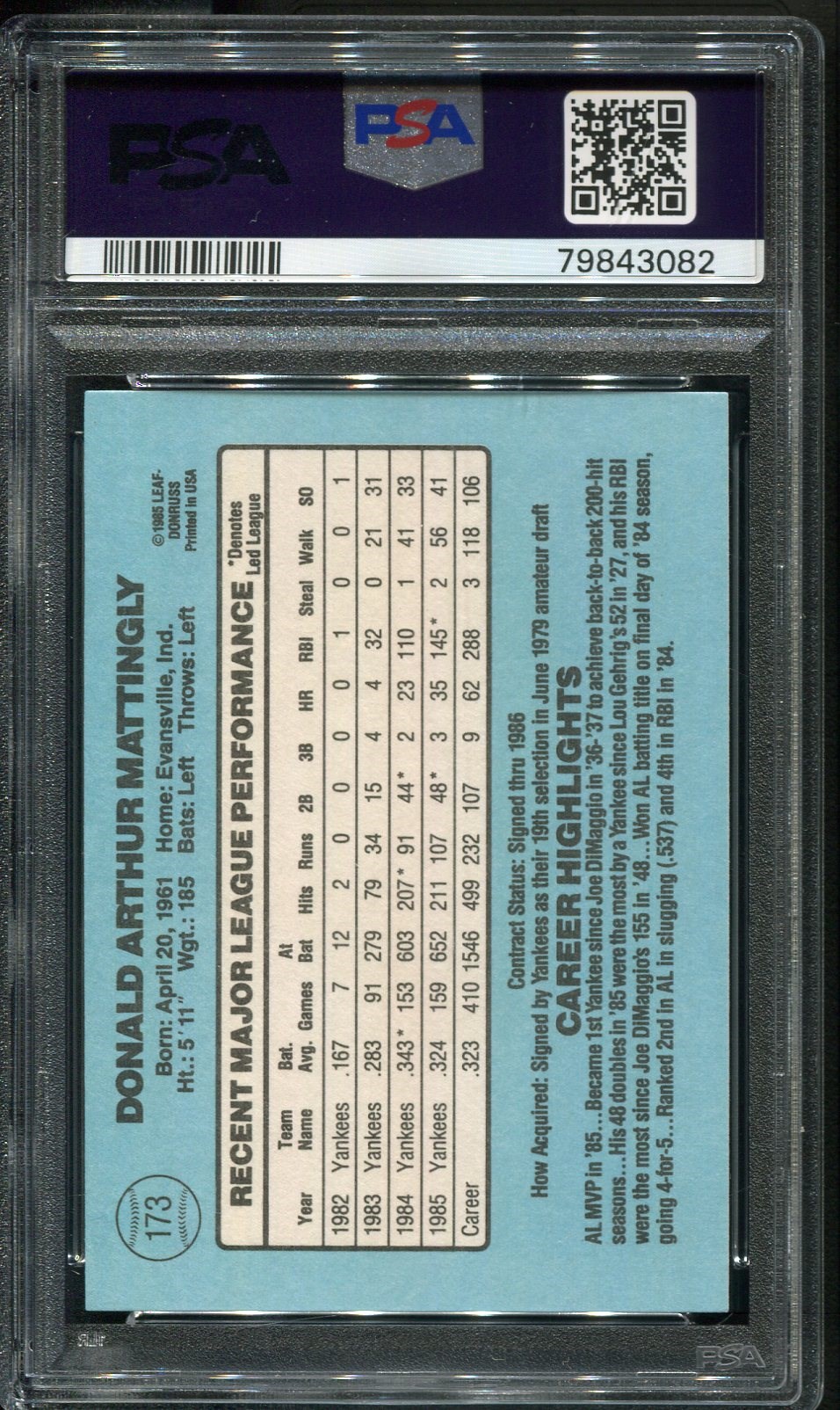 1986 Donruss Don Mattingly #173 PSA Gem Mint 10 - Card comes in a scratch free PSA holder.