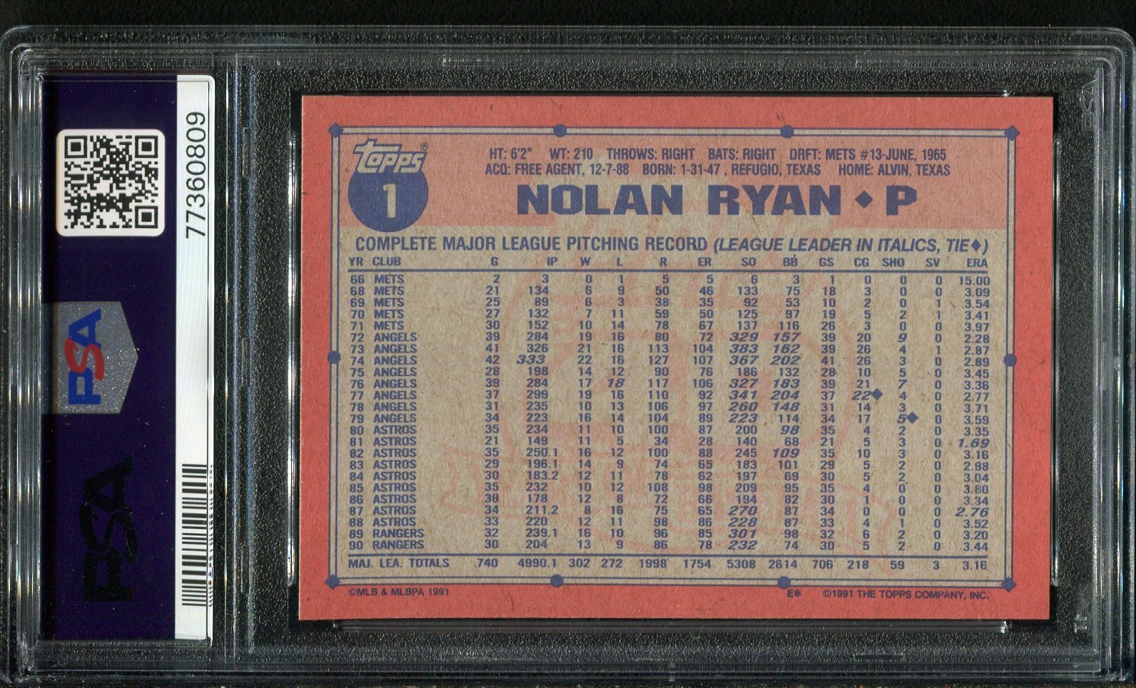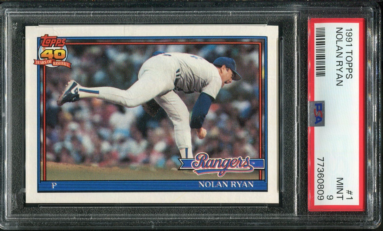 1991 Topps Nolan Ryan #1 PSA Mint 9 - A great action photo of Ryan highlights this 1991 Topps issue. Opening bid starts at just $10.
