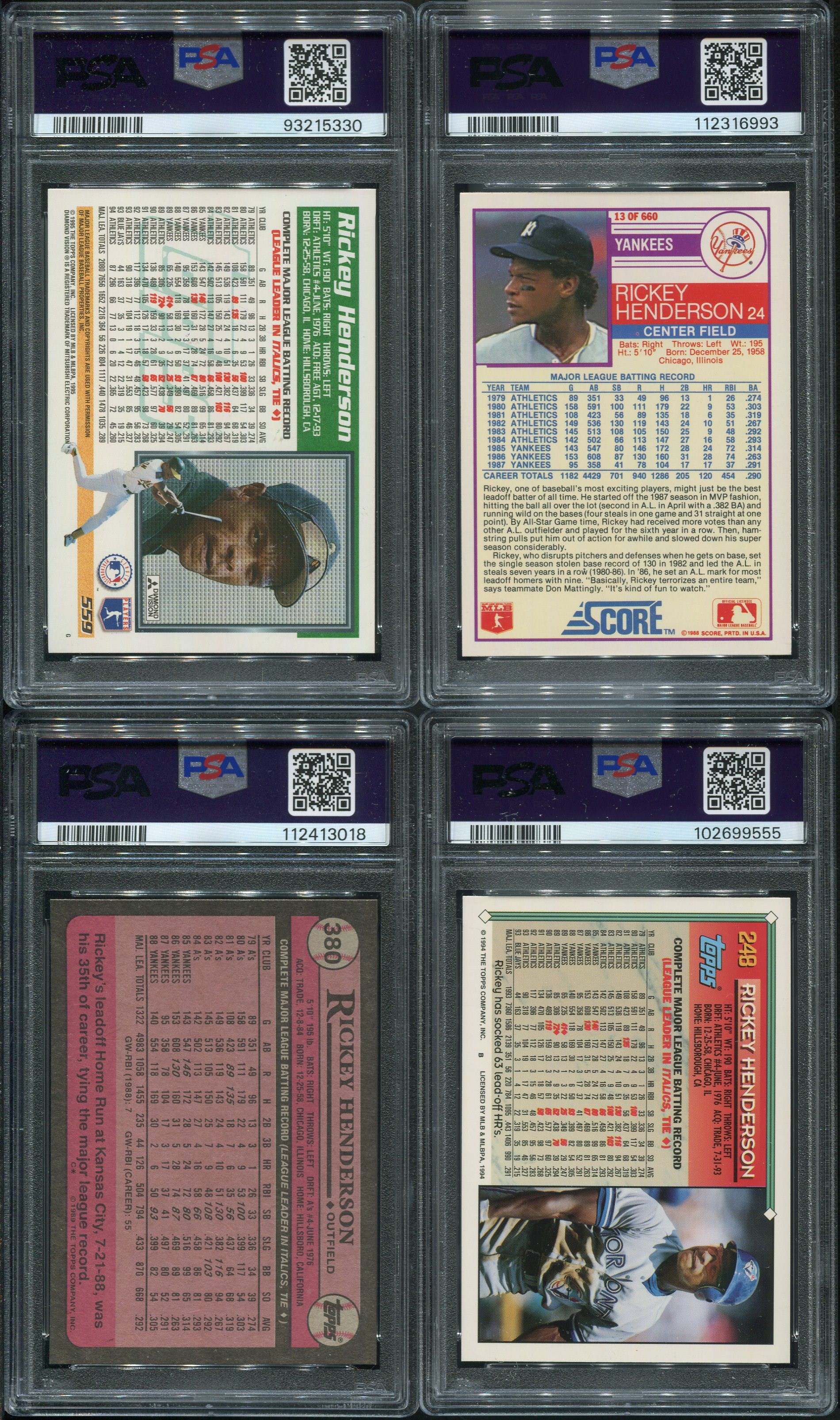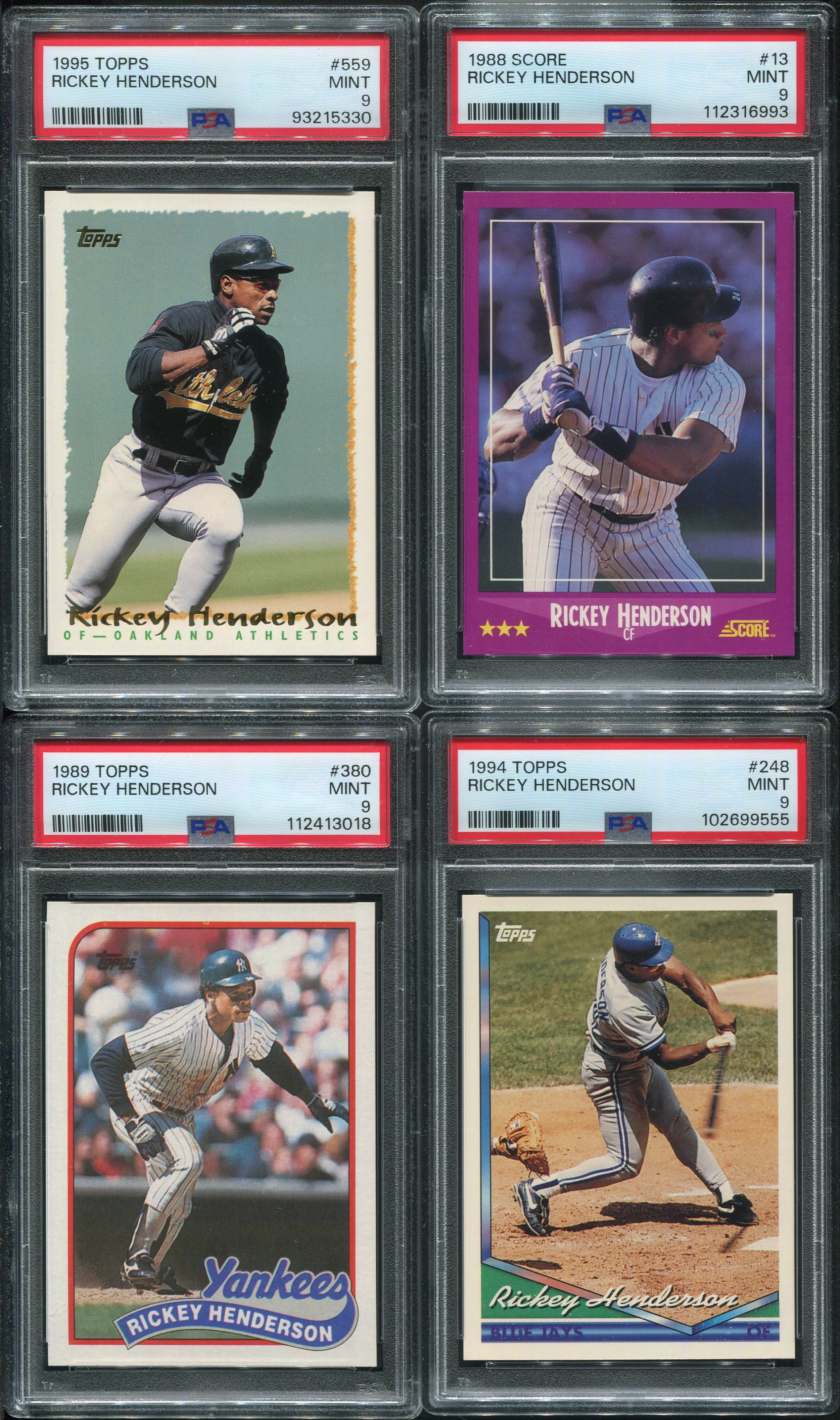 Rickey Henderson Lot of 4 Different PSA Graded Cards All PSA Mint 9's - Lot includes his 1988 Score #13, 1989 Topps #380, 1994 Topps #248, and 1995 Topps #559.  All four cards are graded Mint 9 by PSA.
