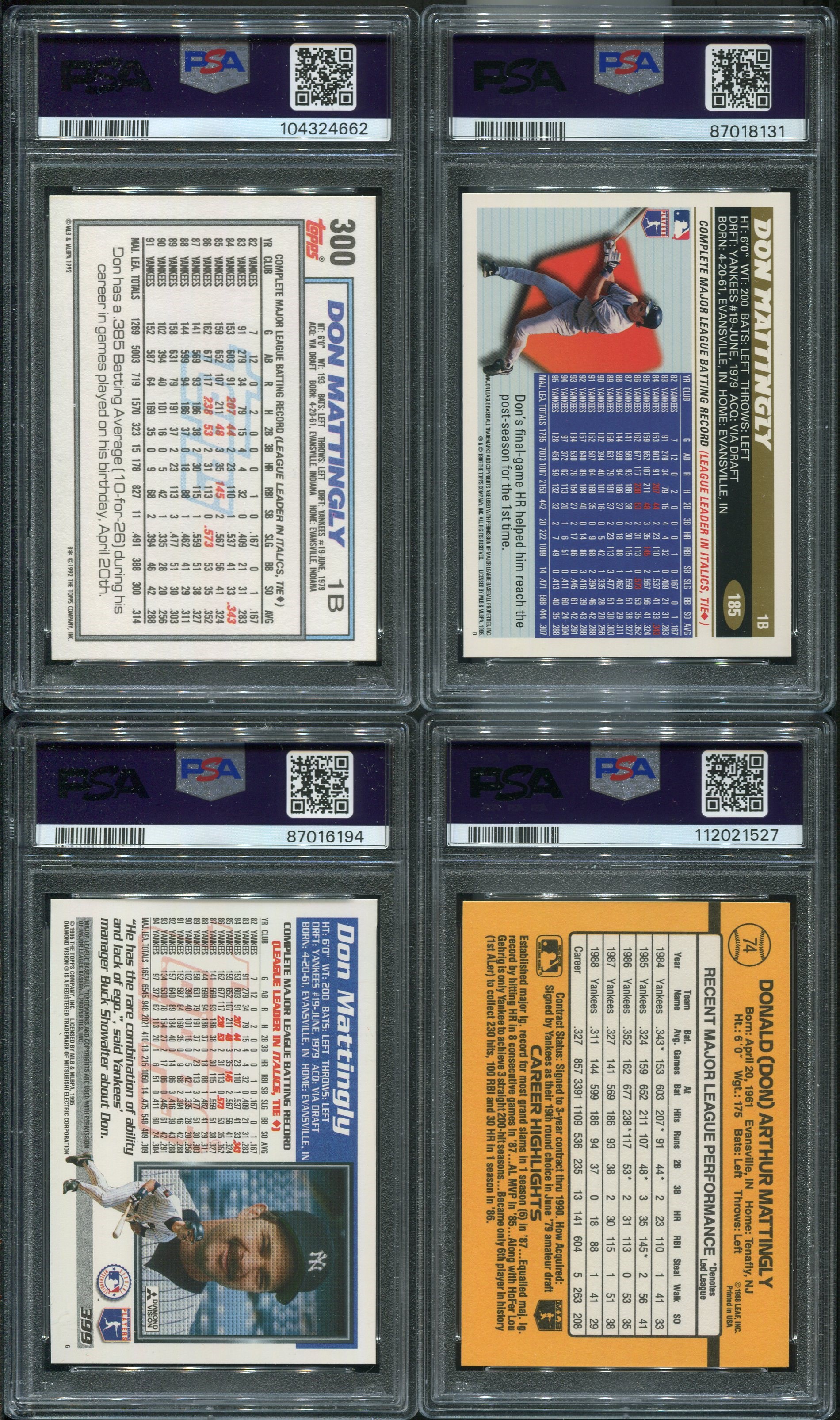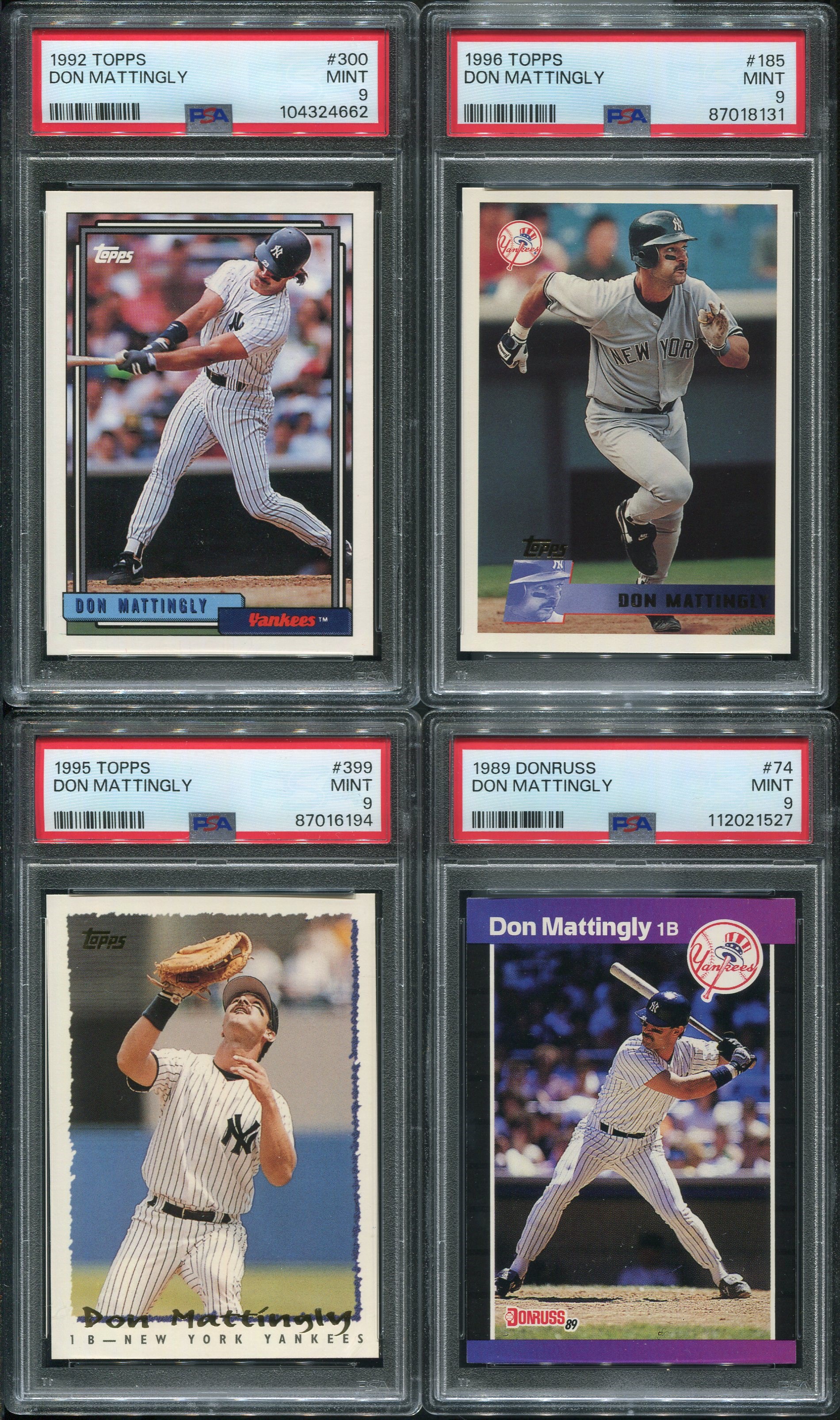 Don Mattingly Lot of 4 Different PSA Graded Cards All PSA Mint 9's - Lot includes his 1989 Donruss #74, 1992 Topps #300, 1995 Topps #399, and 1996 Topps #185. All four cards are PSA Mint 9's.