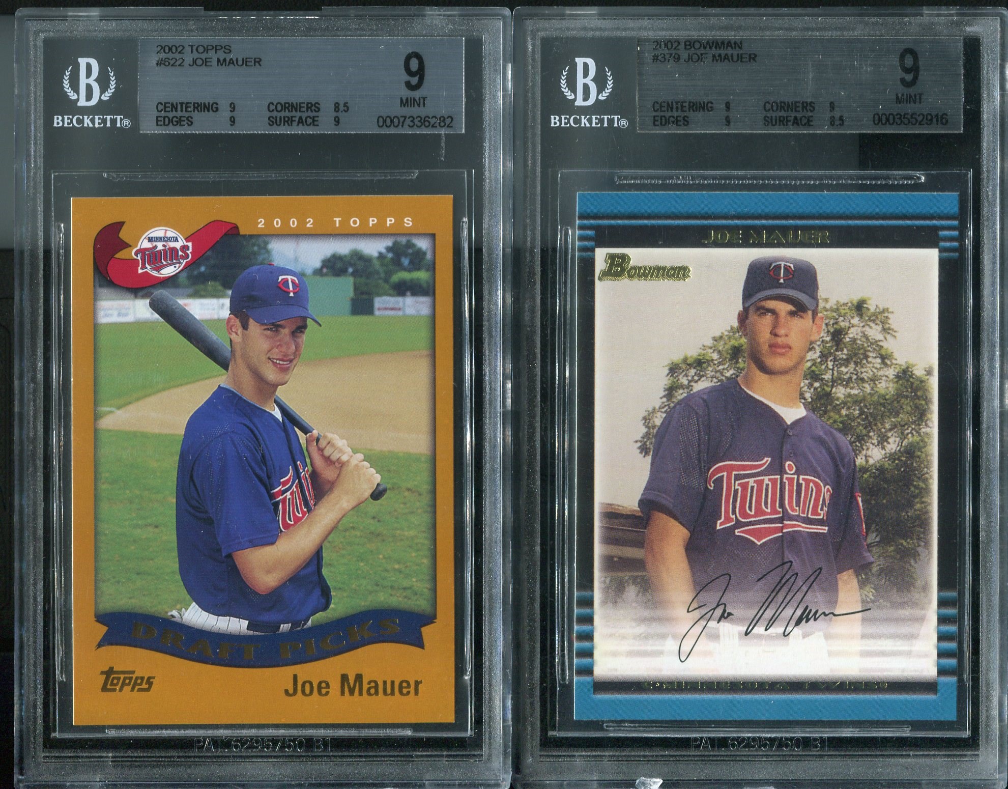 Joe Mauer 2002 Bowman and 2002 Topps RC's Both BGS Mint 9's - Here is a pair of rookie cards of HOFer Joe Mauer.  Both rookies received mint 9 grades from Beckett.