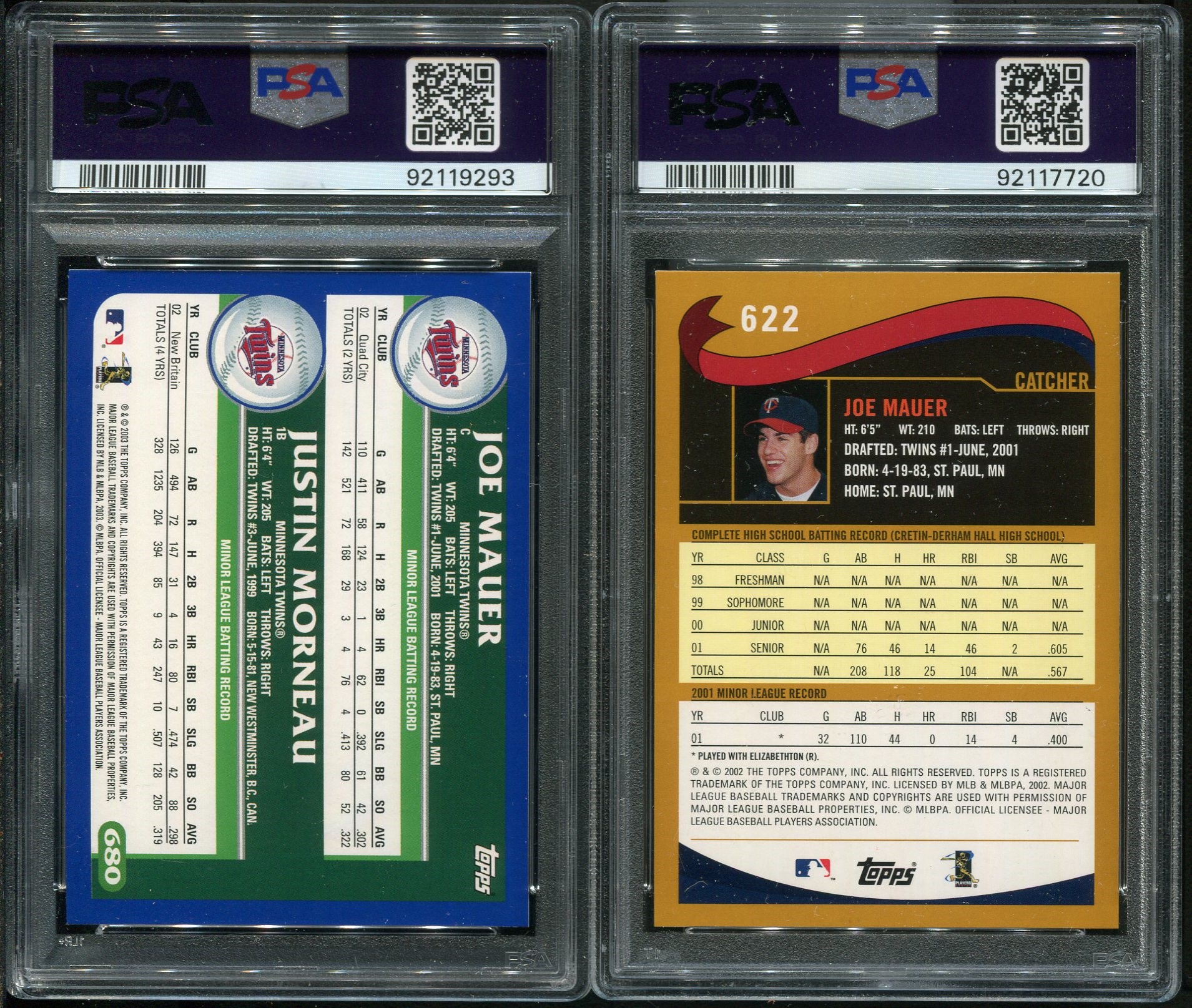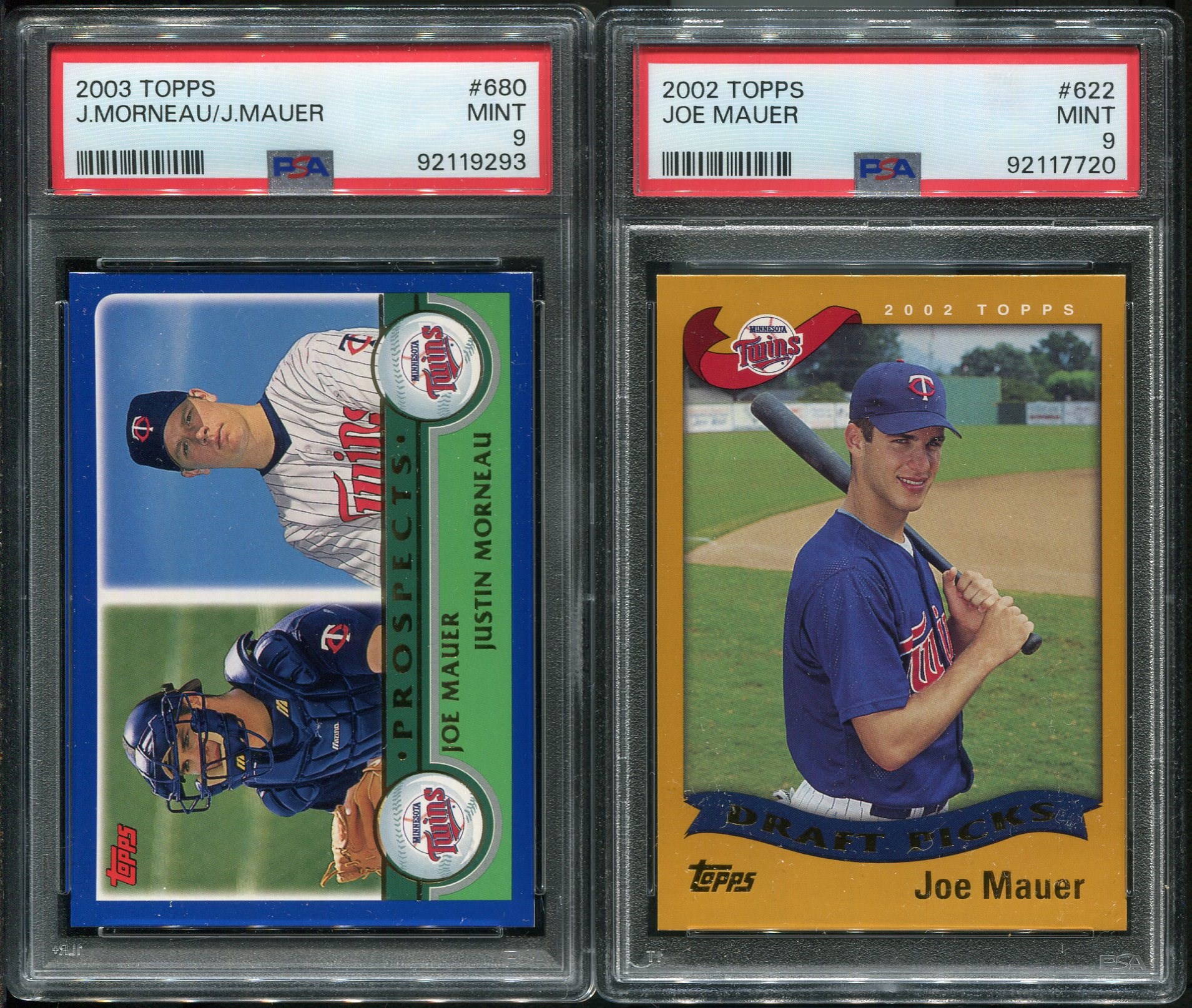 Joe Mauer 2002 Topps RC and 2003 Topps Prospects Both in PSA Mint 9's - Both cards are condition sensitive due to their colored borders.  These two Mauer cards came back Mint 9 by PSA.