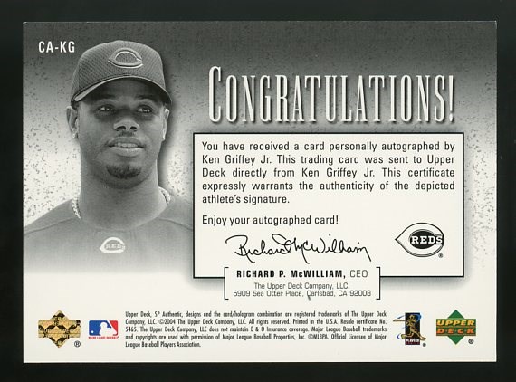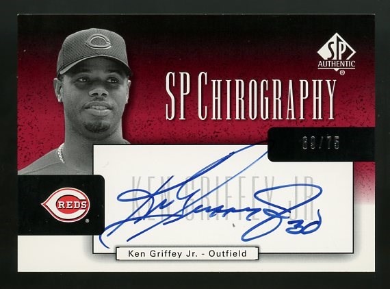 2004 SP Authentic Ken Griffey, Jr. Chirography Autograph Bronze #'d/65 - A great on card autograph of Griffey in NM or better condition.  Limited Griffey autographs have been red hot as of late with most seeing substantial appreciation in value.
