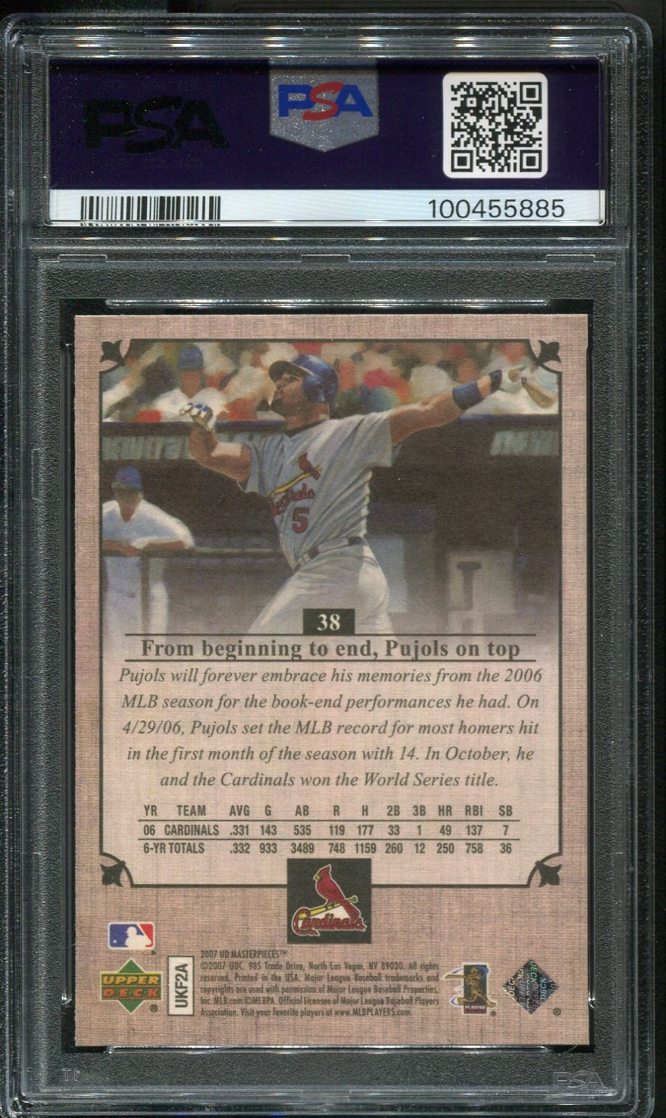 2007 Upper Deck Masterpieces Albert Pujols #38 PSA Gem Mint 10 - An attractive design by Upper Deck, this Pujols graded Gem Mint 10 by PSA and comes in a new PSA holder. Minimum bid starts at just $10.