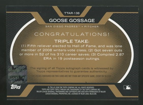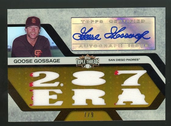 2008 Topps Triple Threads Goose Gossage 6 Piece Relic Autograph Gold #'d/9 - A near perfect autograph plus six game jersey relics make this Gossage card really stand out. The gold parallel version is limited to just nine produced. NM/MT or better.