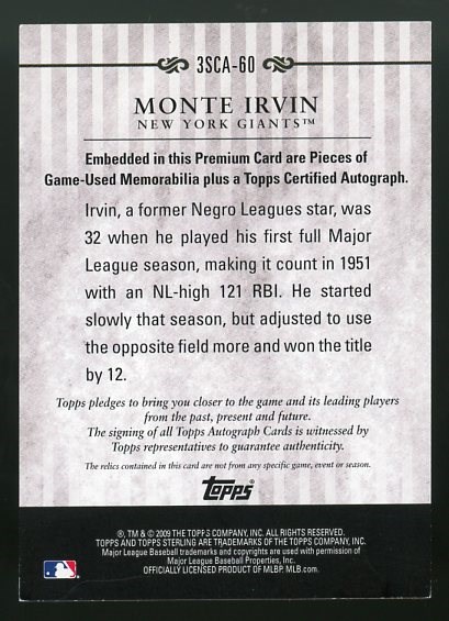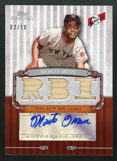 2009 Topps Sterling Monte Irvin Triple Relic Autograph #'d/10 - Three game used bat relics and Irvin's autograph highlight this 2009 Topps Sterling issue.  Card is NM or better.