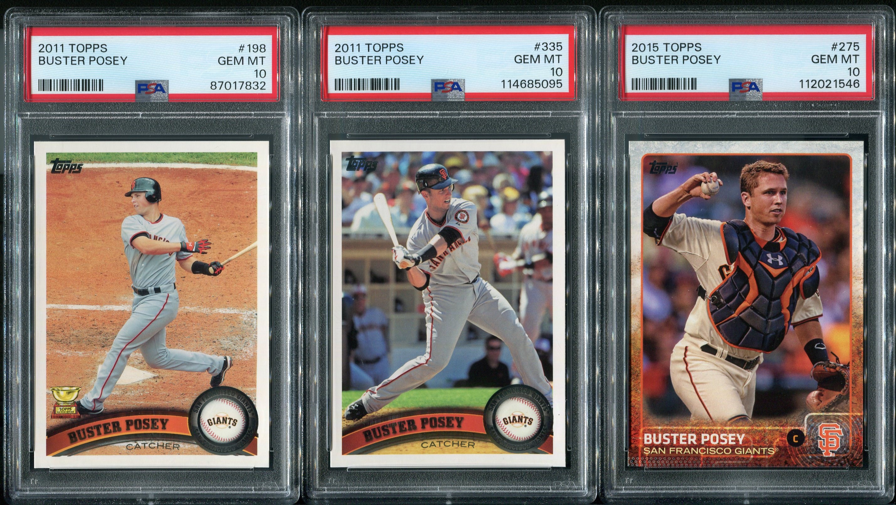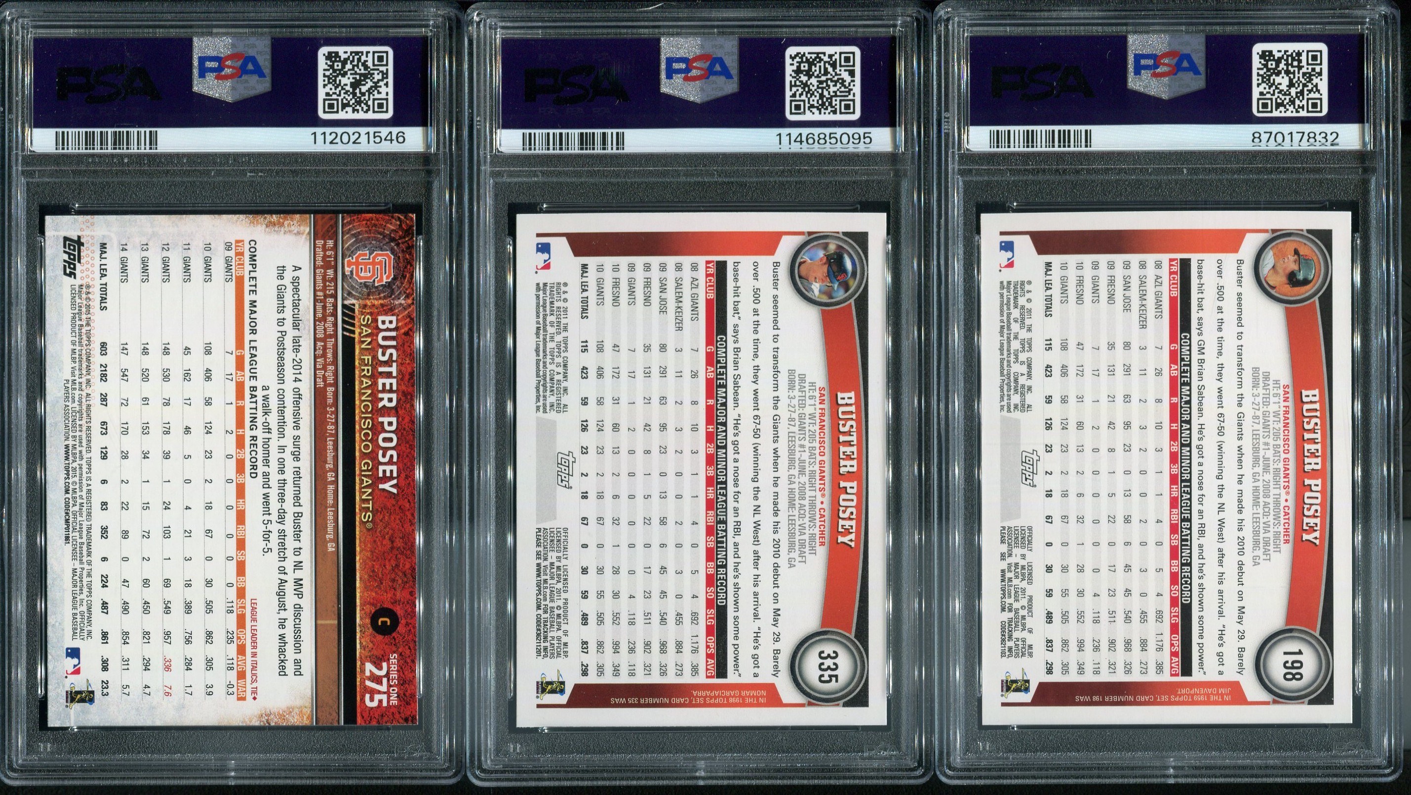Buster Posey 2011 Topps #198, 2011 Topps #335 and 2015 Topps #275 All PSA Gem Mint 10's - All three cards come in scratch free PSA holders. Posey is a likely Hall of Famer, so take advantage of the chance to grab three PSA 10's in one lot.