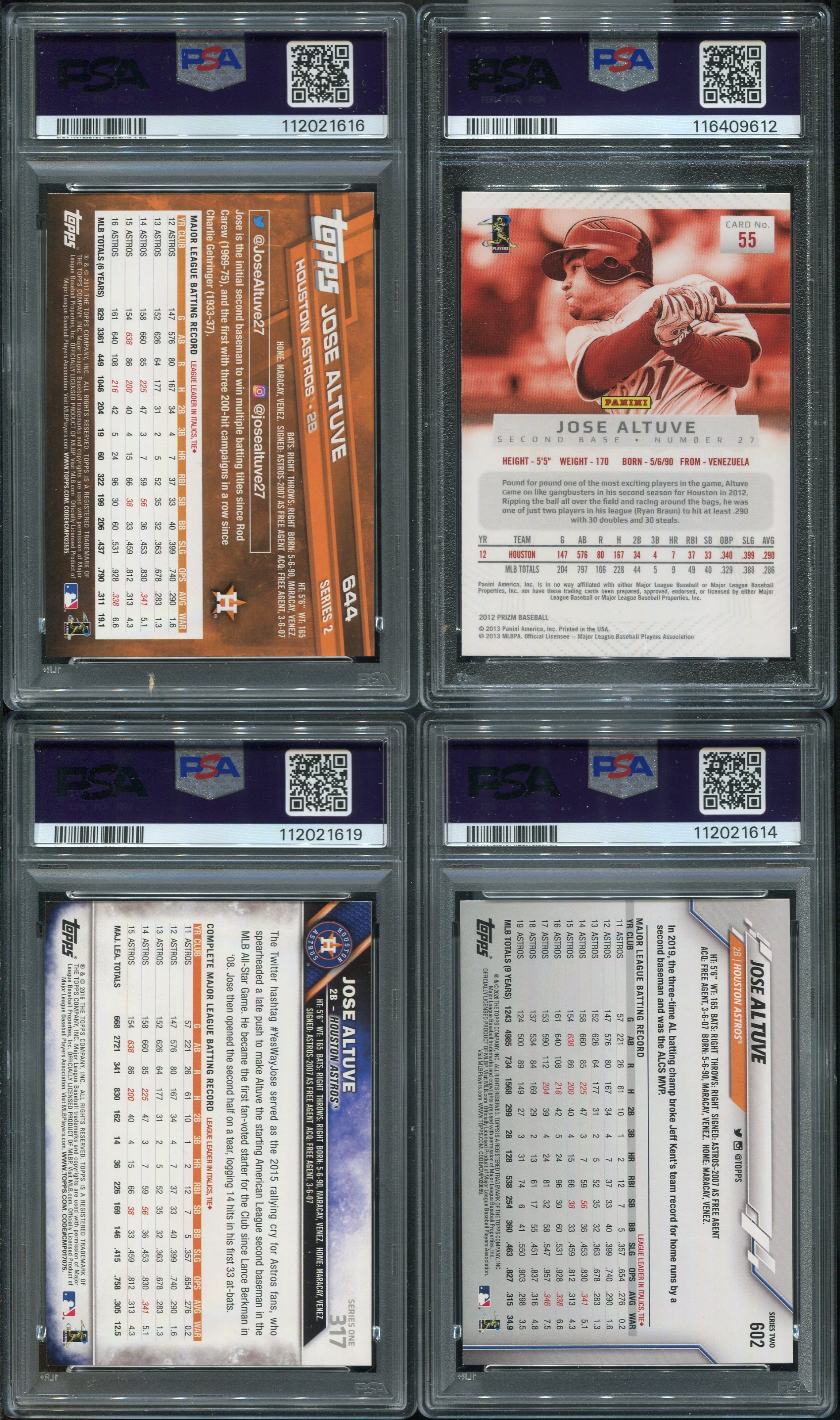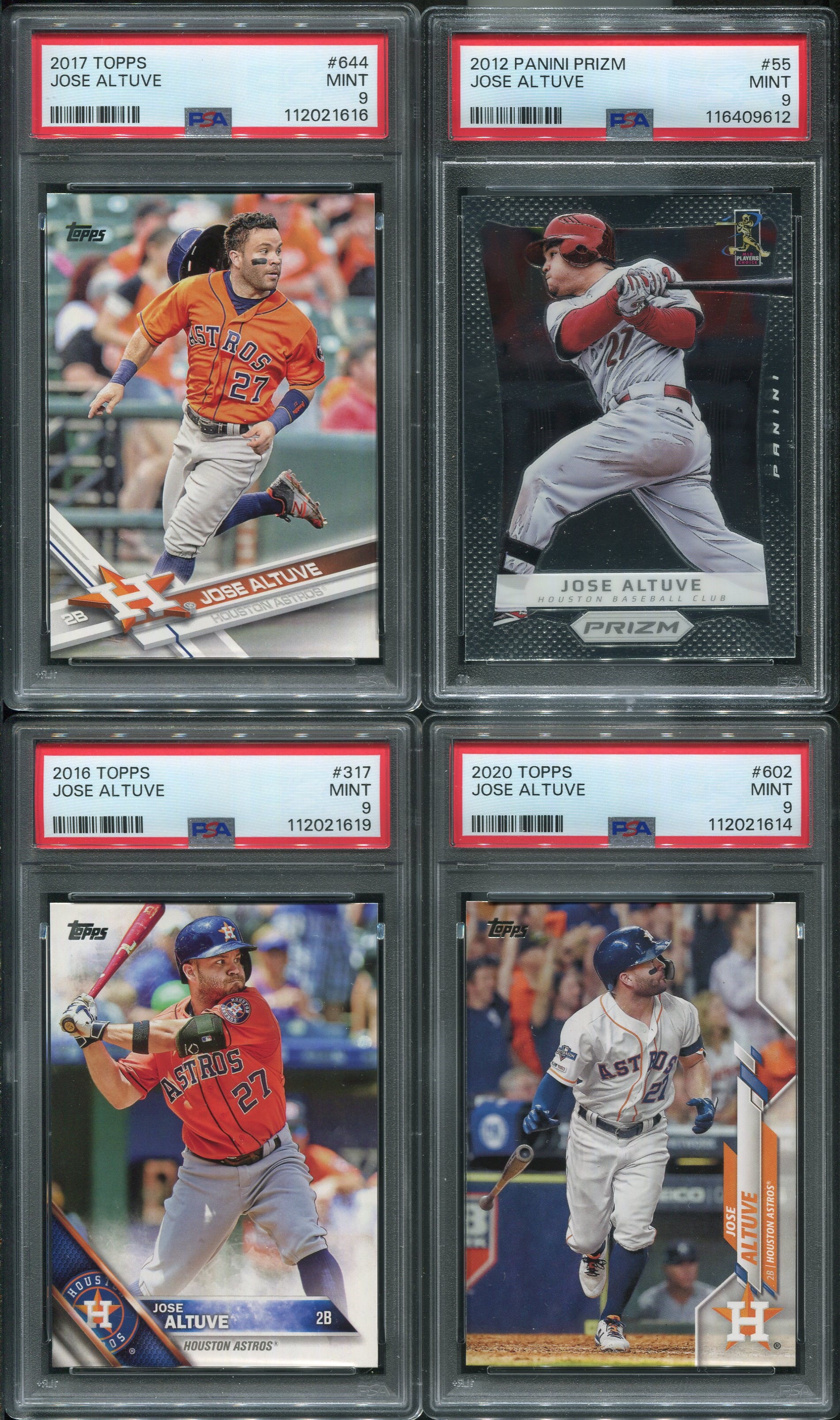 Jose Altuve Lot of 4 Different  All are PSA Mint 9's - Lot includes his 2012 Panini Prizm #55, 2016 Topps #317, 2017 Topps #644, and 2020 Topps #602 all in PSA Mint 9 grade.