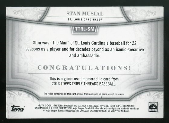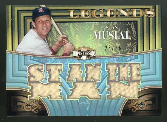 2013 Topps Triple Threads Stan Musial 10 Piece Game Jersey Relic #'d/36 - A highly attractive card of Musial, who was often called "Stan the Man". Card is NM/MT or better and is limited to 36 produced.