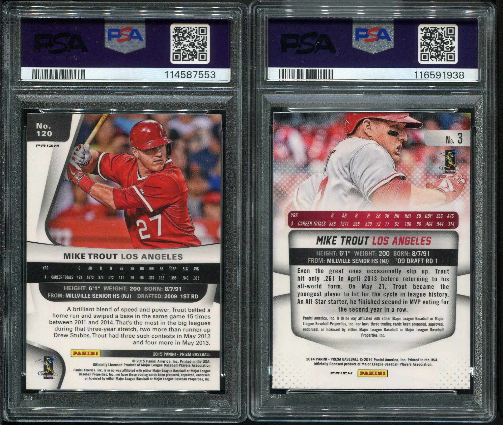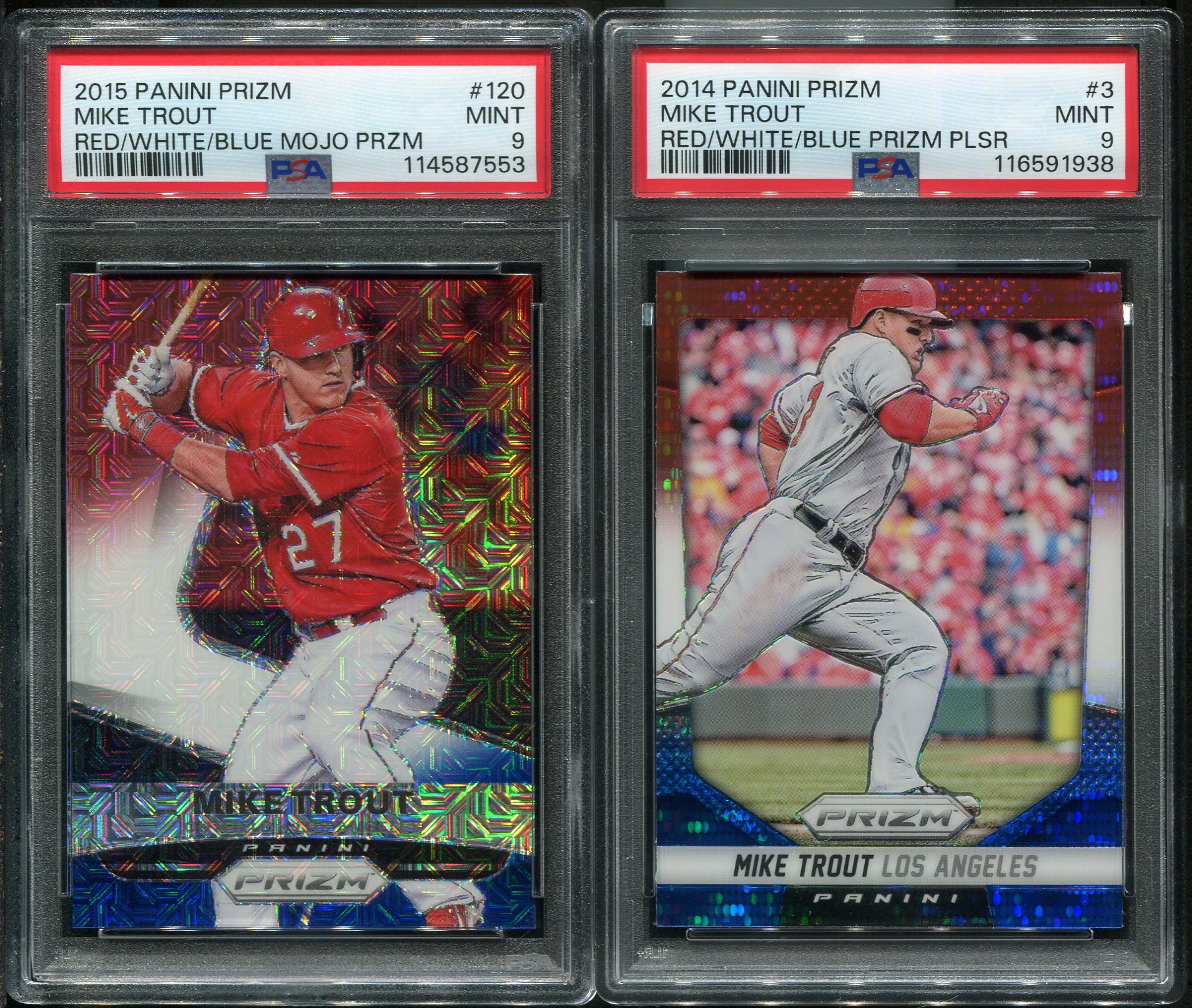 Mike Trout 2014 Panini Mojo Prizm and 2015 Panini R/W/B Mojo Prizm Both PSA Mint 9's - Here are two colorful parallel cards of Mike Trout, both in PSA Gem Mint 10 grade.