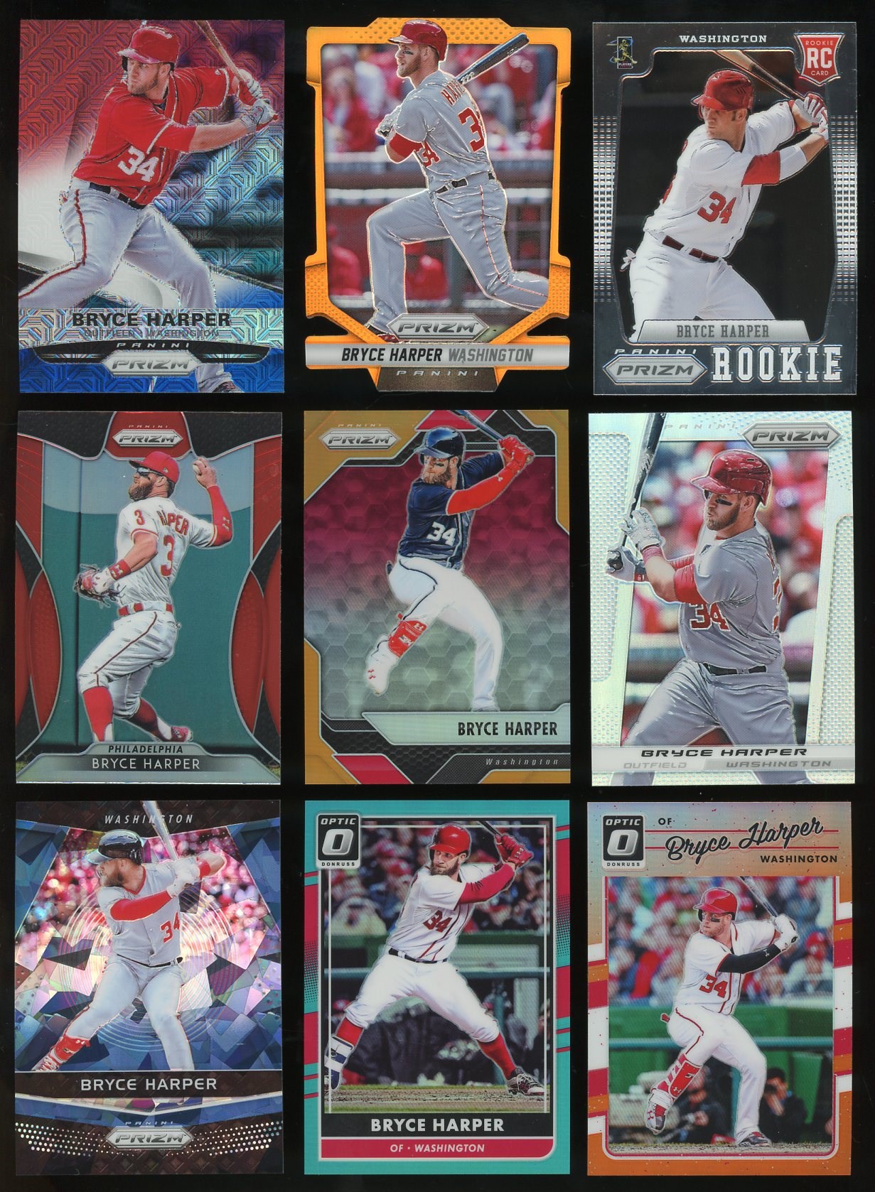 Bryce Harper Lot of 9 Different Panini Prizm & Optic Parallels- One rookie and several colorful parallels highlight this lot of Harper cards.  Cards are NM or better.