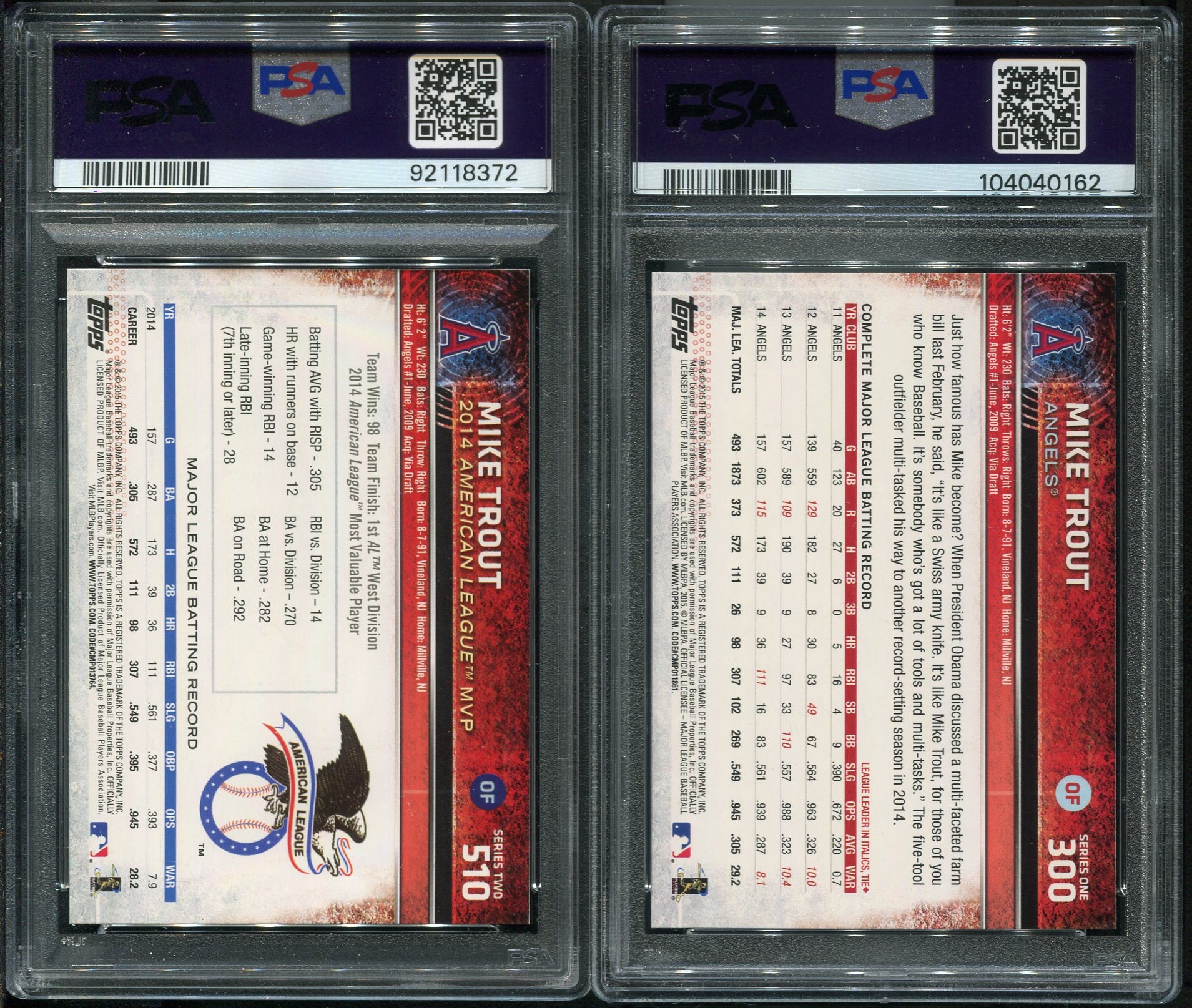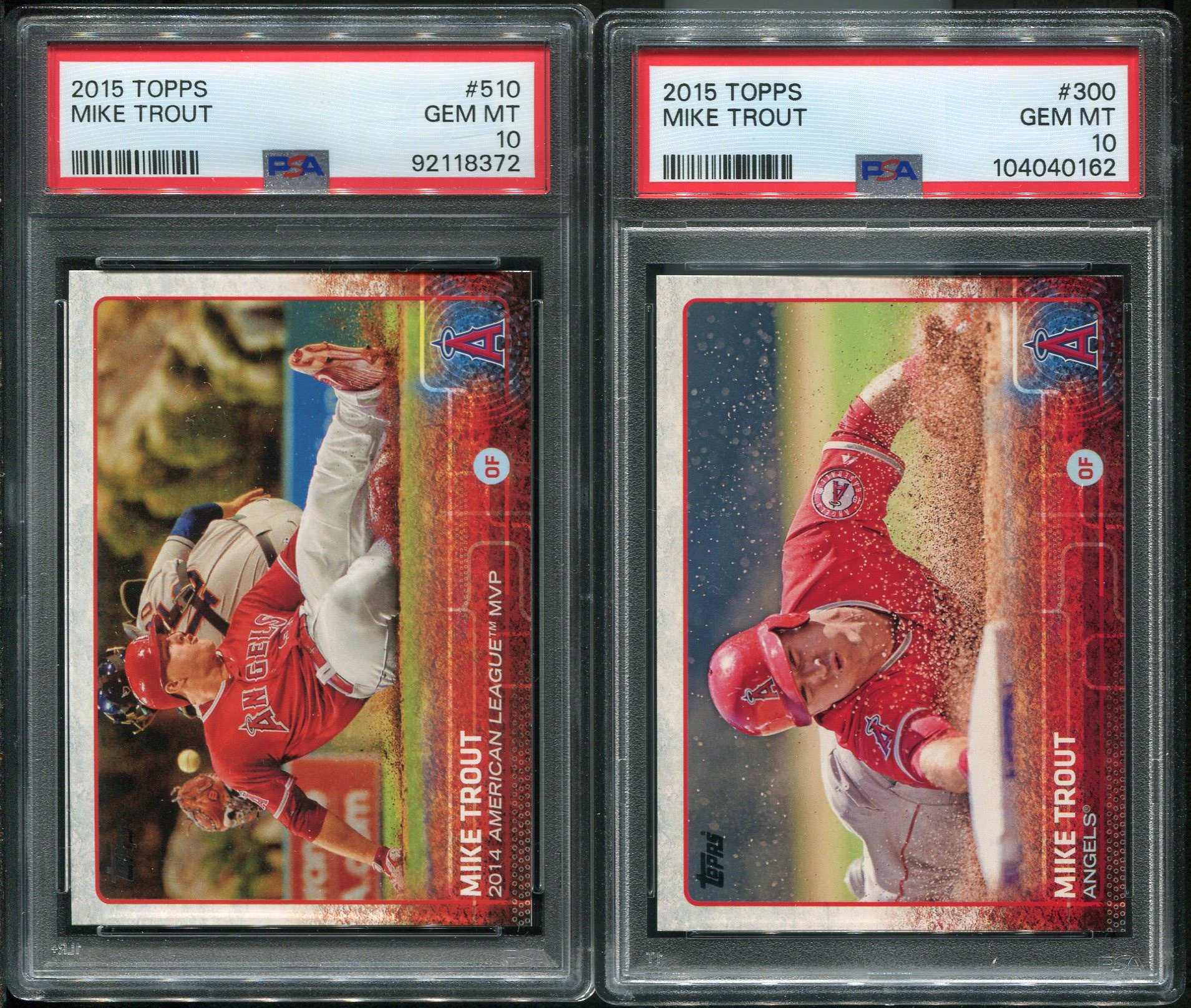 Mike Trout 2015 Topps #300 and 2015 Topps #510 Both PSA Gem Mint 10's - Lot is for two different cards issued by Topps in 2015 of Mike Trout. Both cards are graded PSA Gem Mint 10.