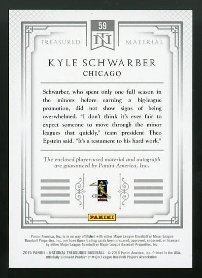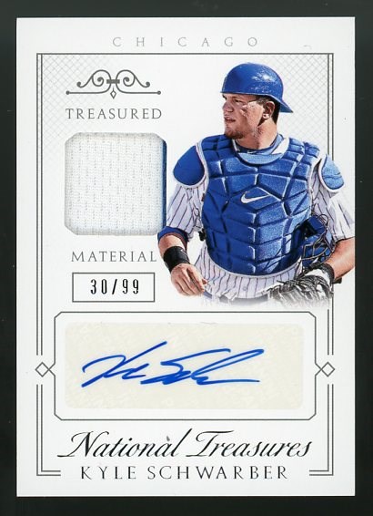 2015 National Treasures Kyle Schwarber Treasured Material Jersey Autograph #'d/99 - Here is an early issue of Schwarber from 2015 National Treasures. This relic autograph is limited to 99 produced and is in NM/MT or better condition.