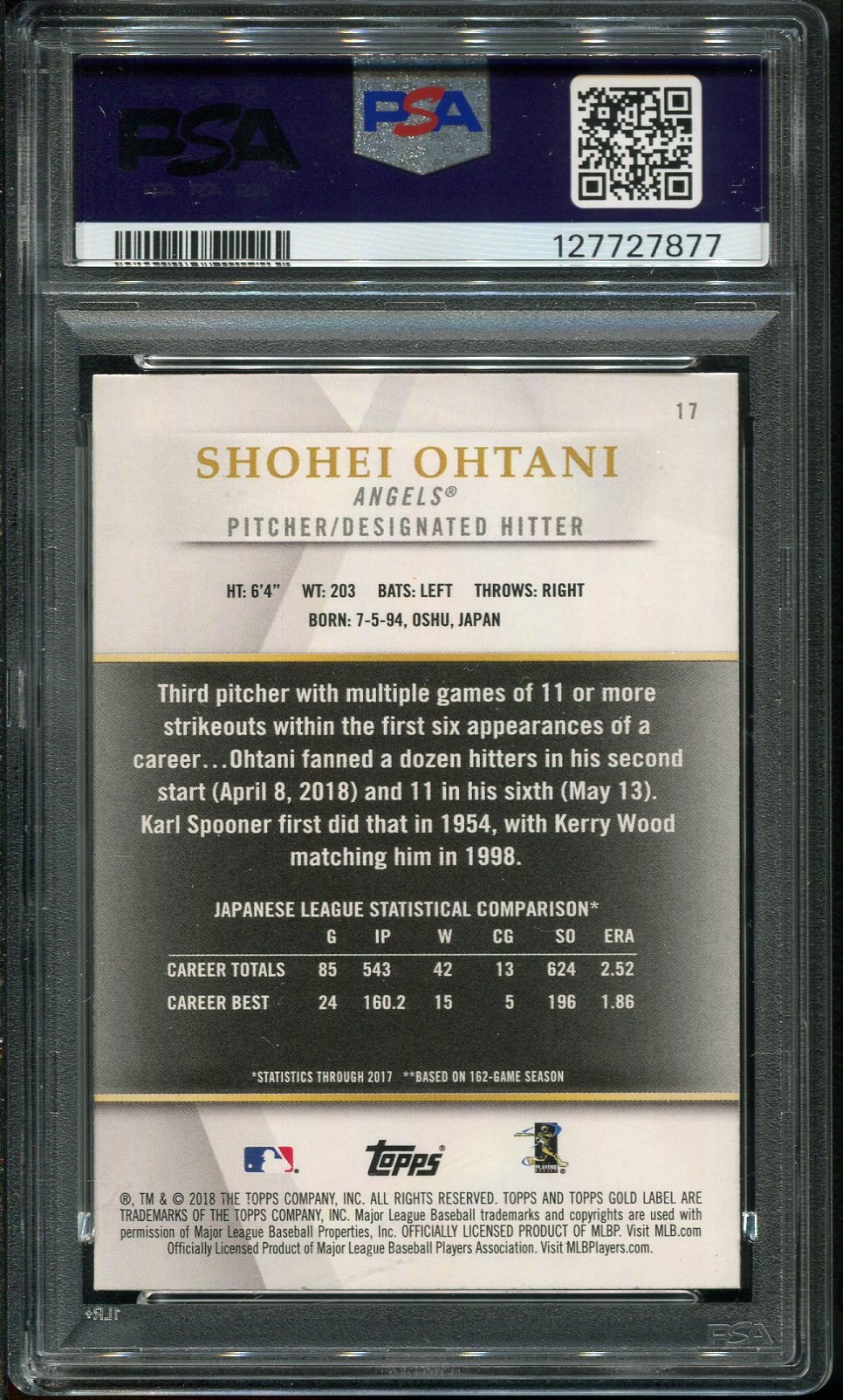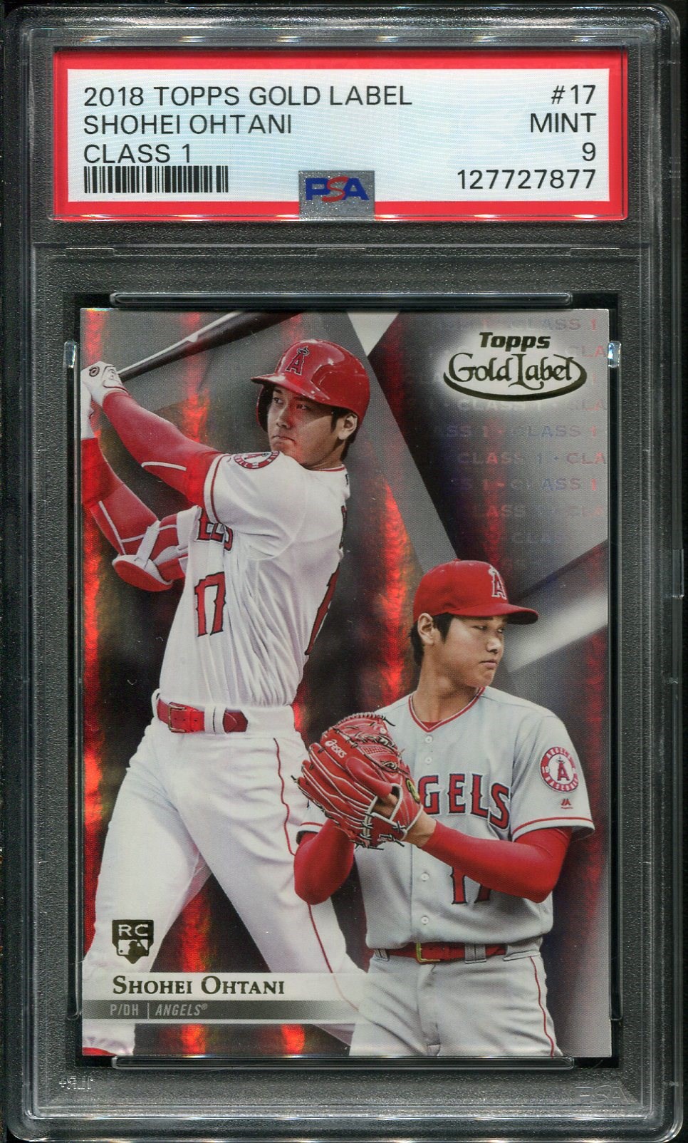 2018 Topps Gold Label Class 1 Shohei Ohtani RC #17 PSA Mint 9 - A highly attractive issue by Topps, the Gold Label brand is much tougher to find than other Ohtani Topps/Topps Chrome issues.