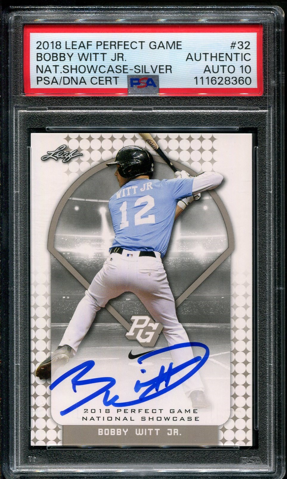2018 Leaf Perfect Game Bobby Witt, Jr. RC #32 Showcase Silver Autographed with PSA 10 Auto - One of the very few 2018 issues of Witt, Jr, which he signed in bold, blue sharpie. Signature has been authenticated and graded Gem Mint by PSA/DNA.