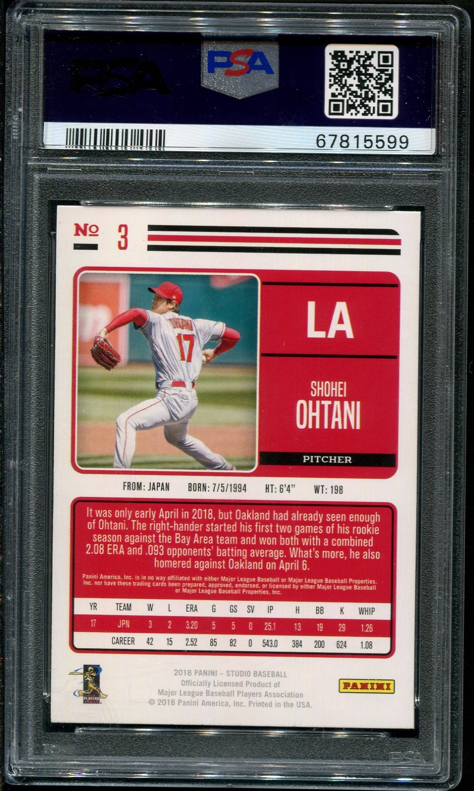 2018 Panini Chronicles Studio Shohei Ohtani RC #3  PSA Gem Mint 10 - This is a rookie card of Ohtani that you don't see often.  This Panini issue was a much lower production than most of Ohtani's mainstream rookies.