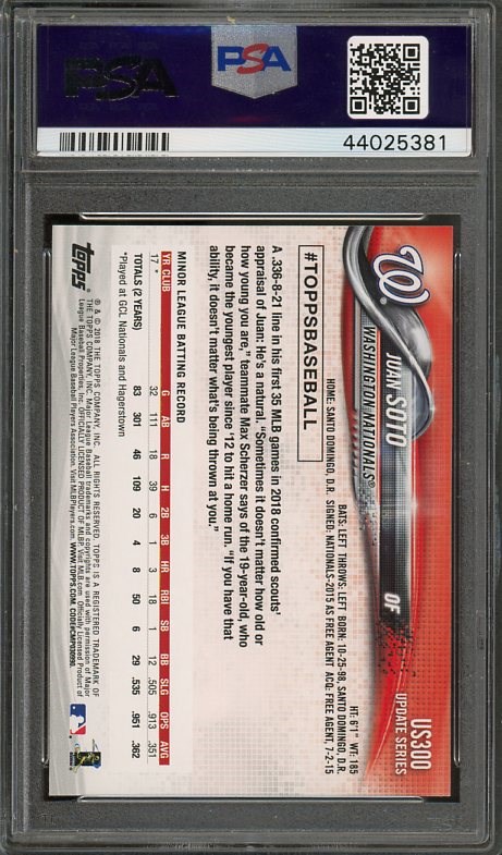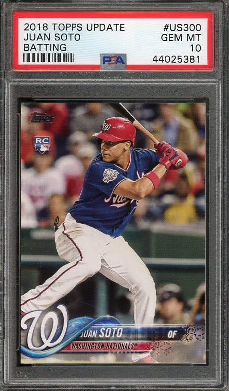 2018 Topps Update Juan Soto RC #US300 PSA Gem Mint 10 - Here is one of Soto's most popular rookie cards. Card comes in a scratch free PSA holder.