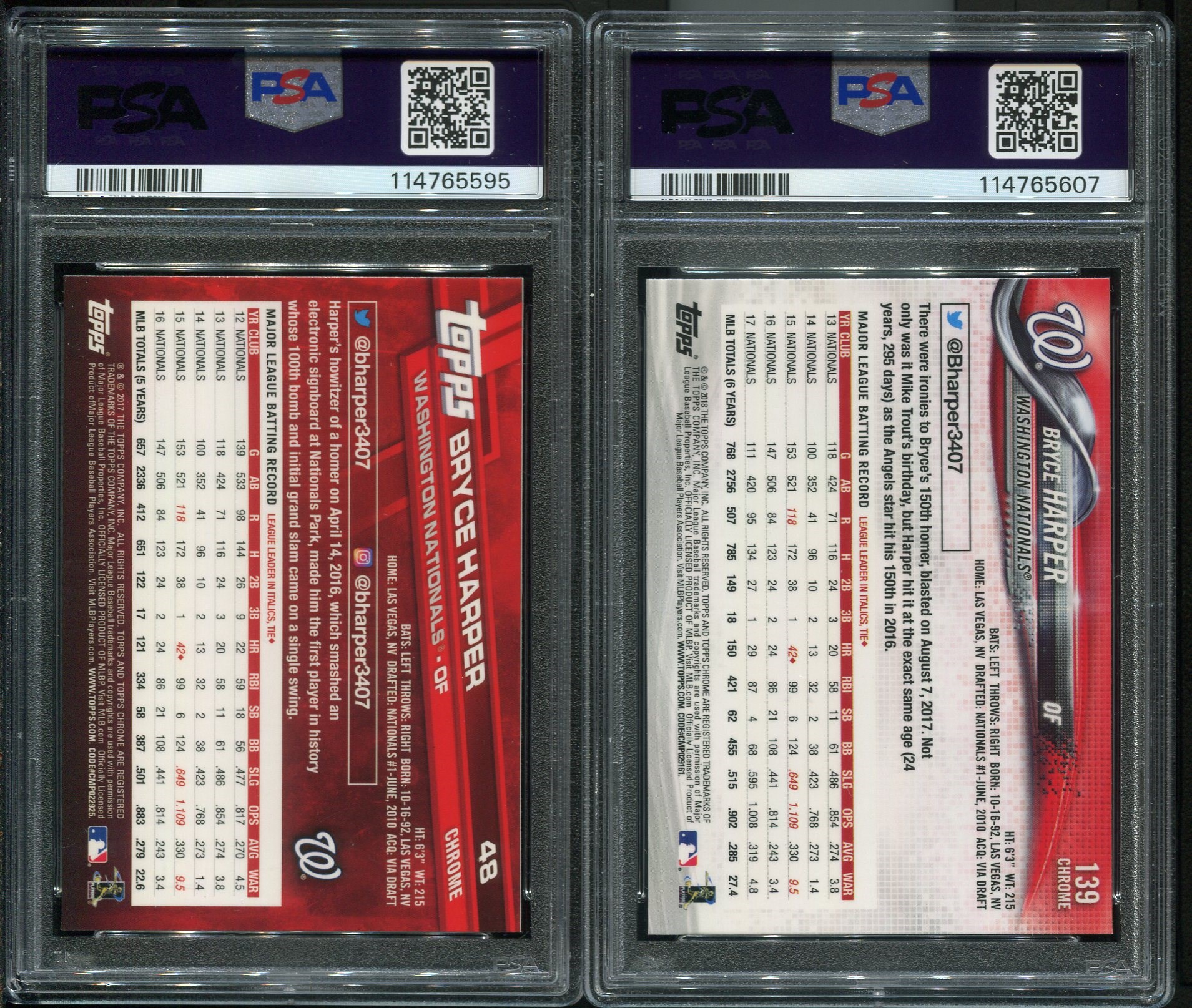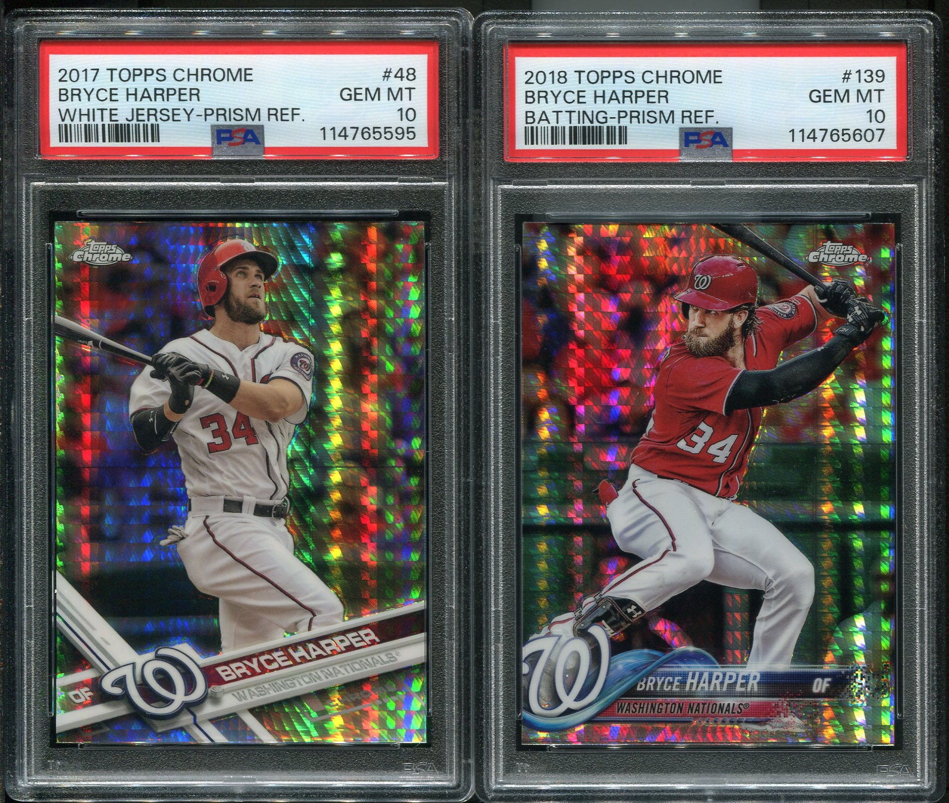 Bryce Harper 2017 and 2018 Topps Chrome Prism Refractors  Both are PSA Gem Mint 10's - Both cards were recently graded and come in new PSA holders.