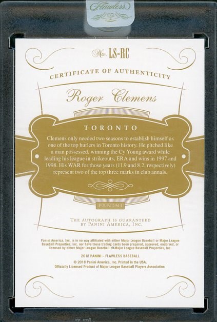 Lot # 281: 2018 Panini Flawless Roger Clemens Legendary Signatures Autograph #1/7