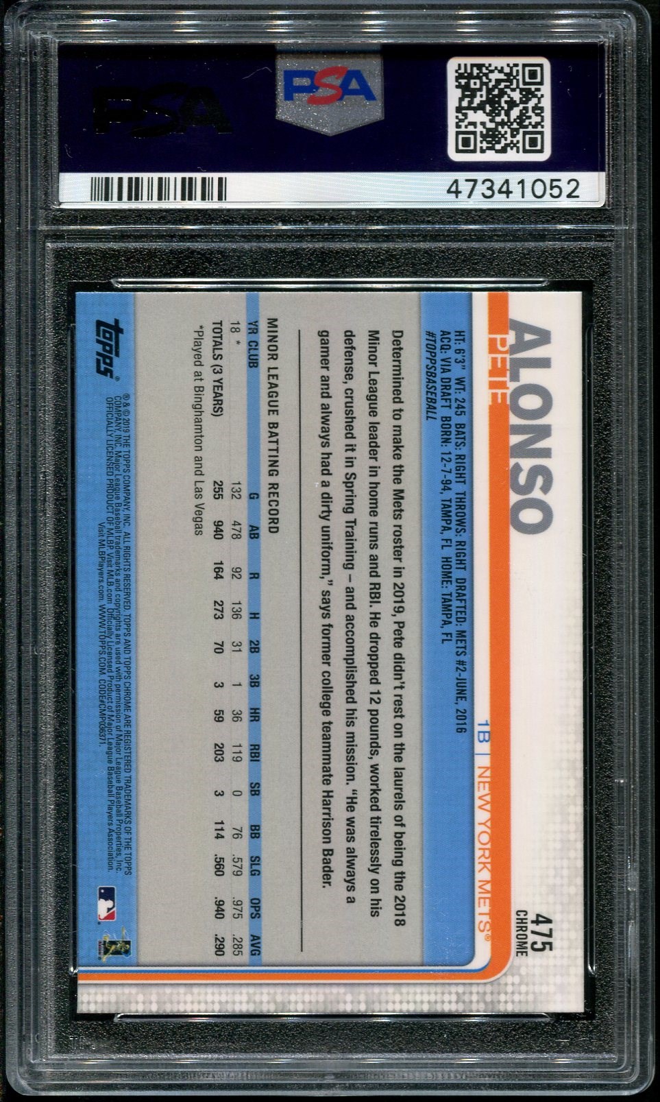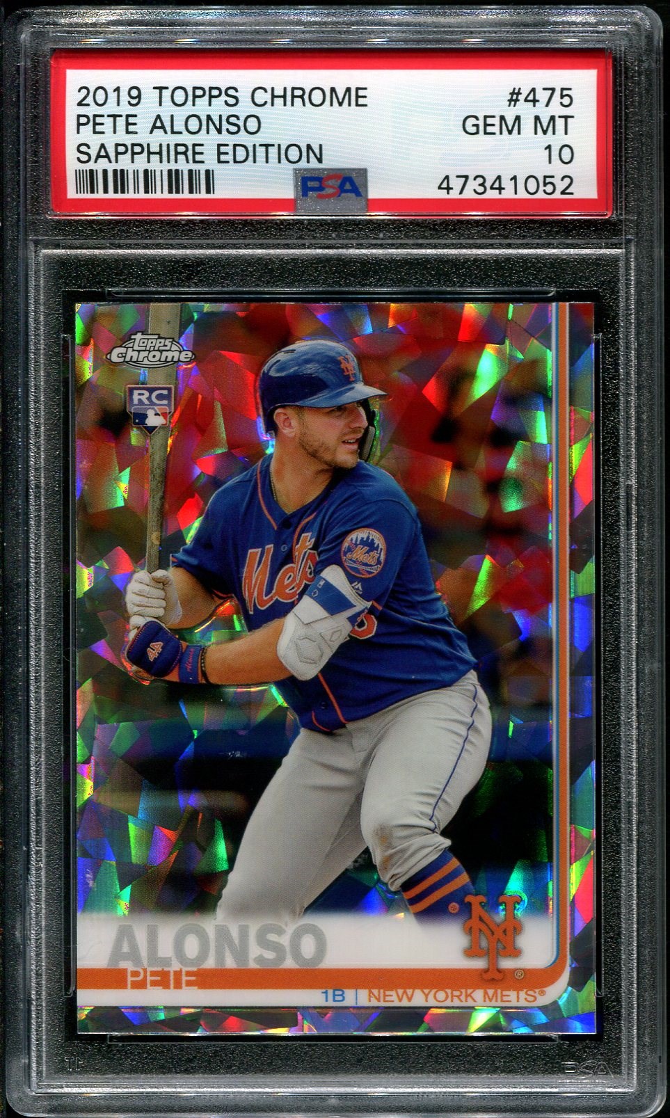 2019 Topps Chrome Pete Alonso Sapphire Edition RC #475 PSA Gem Mint 10 - A tough parallel rookie of Alonso in PSA Gem Mint 10 grade. Card comes in a scratch free PSA holder.