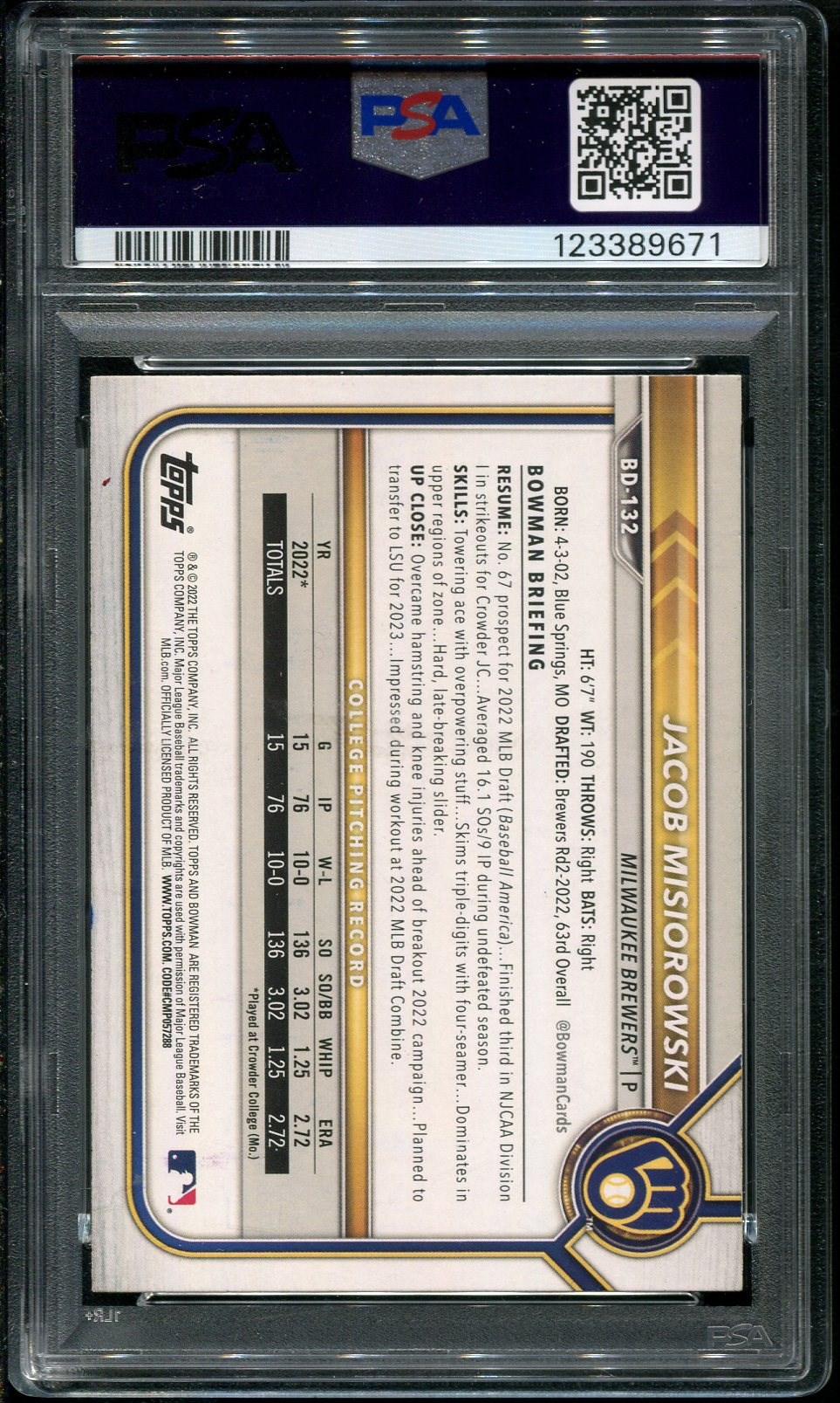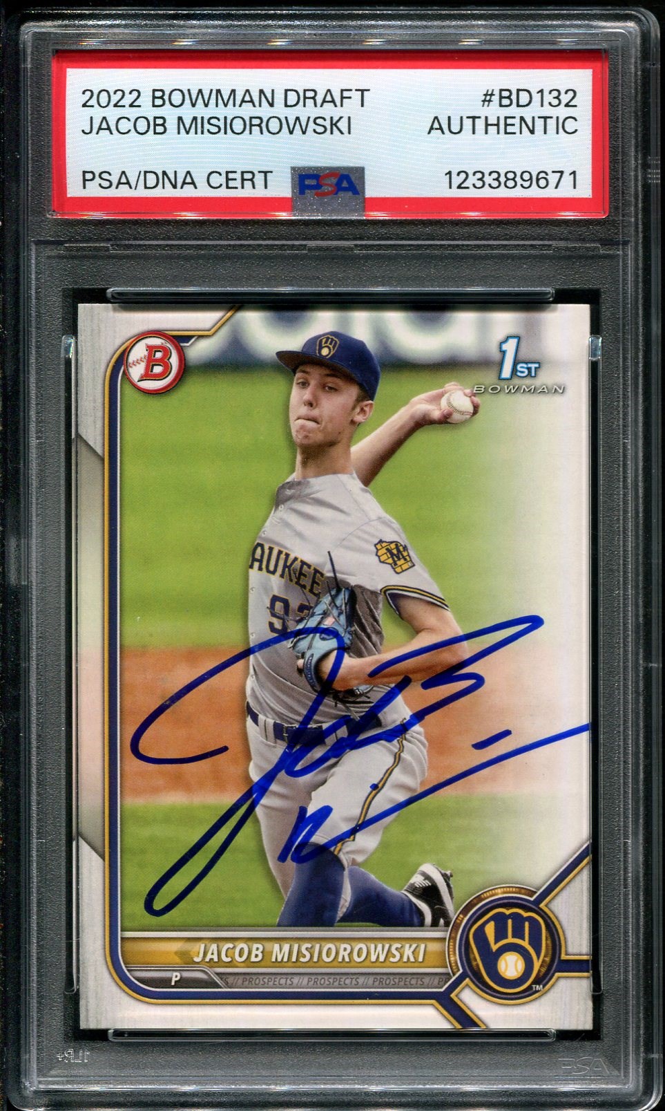 2022 Bowman Draft Jacob Misiorowski RC #BD132 Autographed PSA/DNA Authentic - A great young pitcher who had an amazing 2025. Card was recently graded and comes in a new PSA holder.
