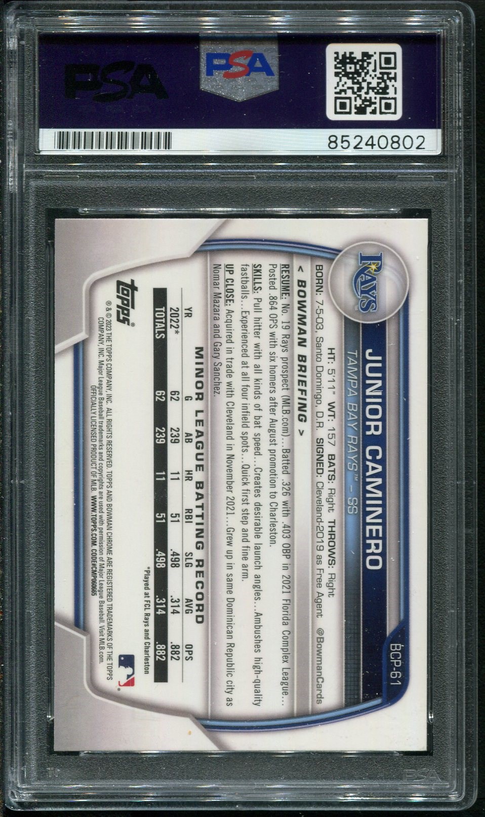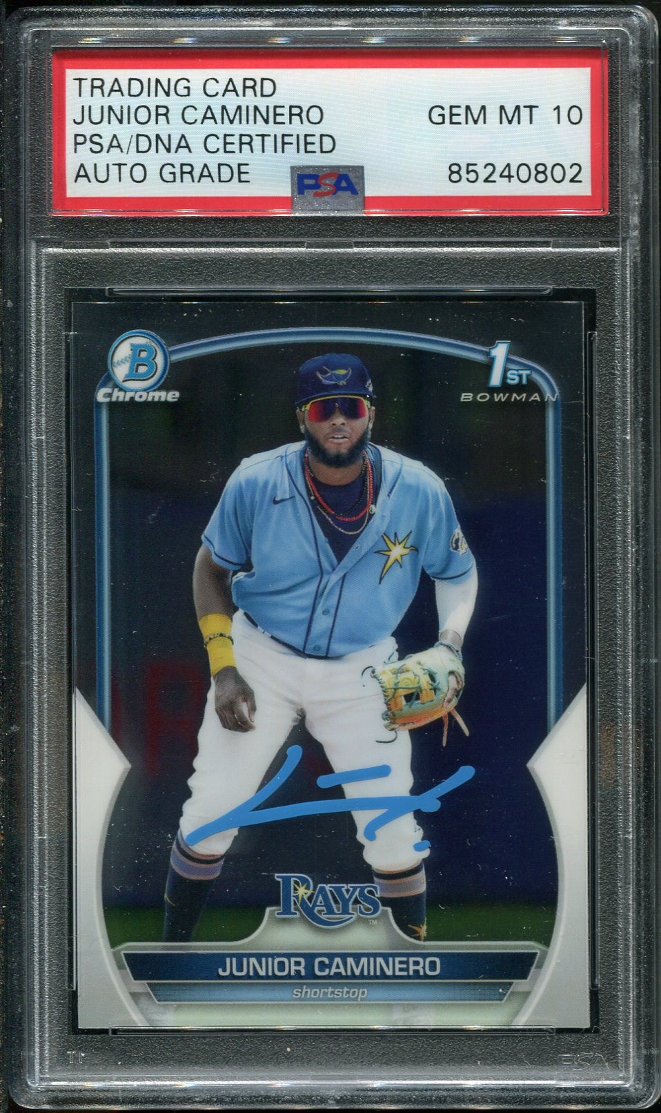 2023 Bowman Chrome Prospects Junior Caminero RC #BCP61 Autographed with PSA 10 Autograph grade. The light blue sharpie matches perfectly to Caminero's jersey, making this a very attractive card.