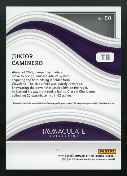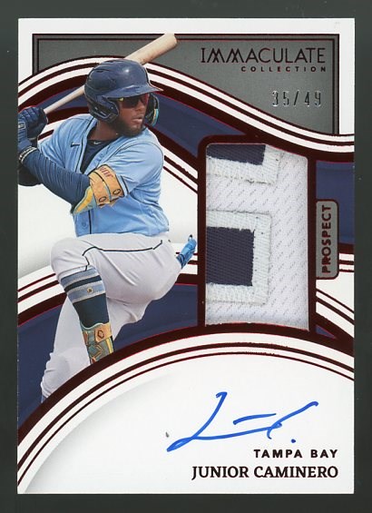 2023 Panini Immaculate Junior Caminero 2 Color Patch Autograph RC Ruby #'d/49 - A prominent, two color patch plus Camanero's autograph, make this a special card to add to your collection.  NM/MT