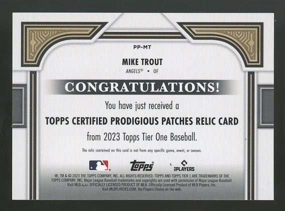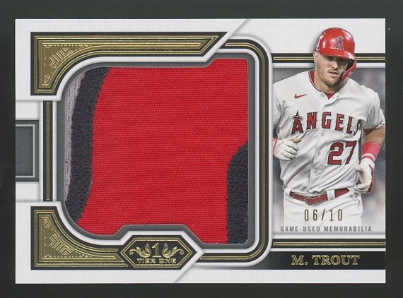 2023 Topps Tier One Mike Trout Prodigious Patches 3 Color Jumbo Relic #'d/10 - This card really stands out with it's huge three color game used patch relic that takes up half the card!  These jumbo patch relics were limited to just ten made, so don't hesitate on your chance to add this one to your collection.