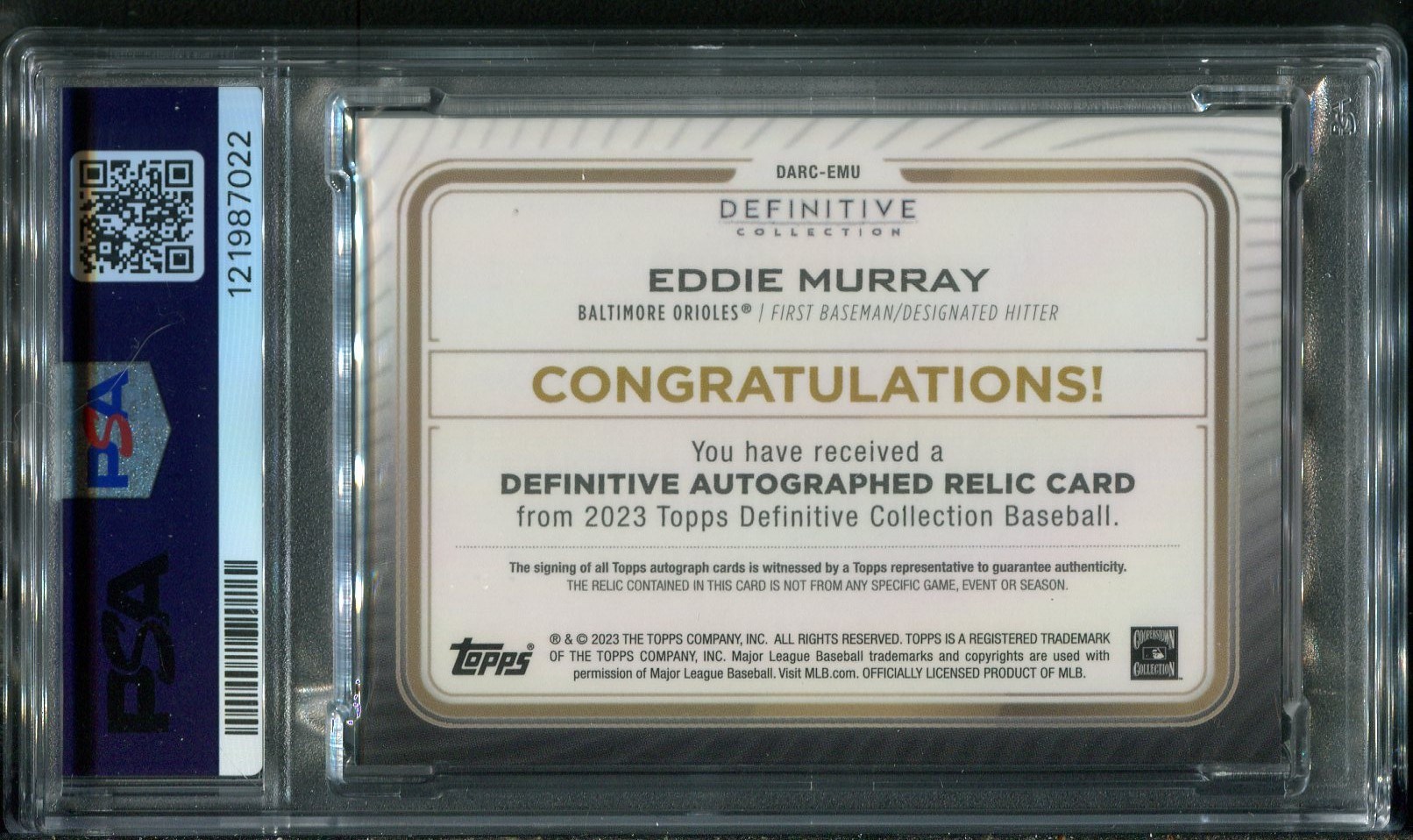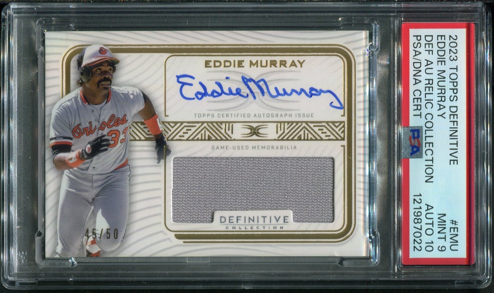 2023 Topps Definitive Eddie Murray Game Jersey Autograph #'d/50 PSA 9 with PSA 10 Auto - A high end Murray card to add to your collection.