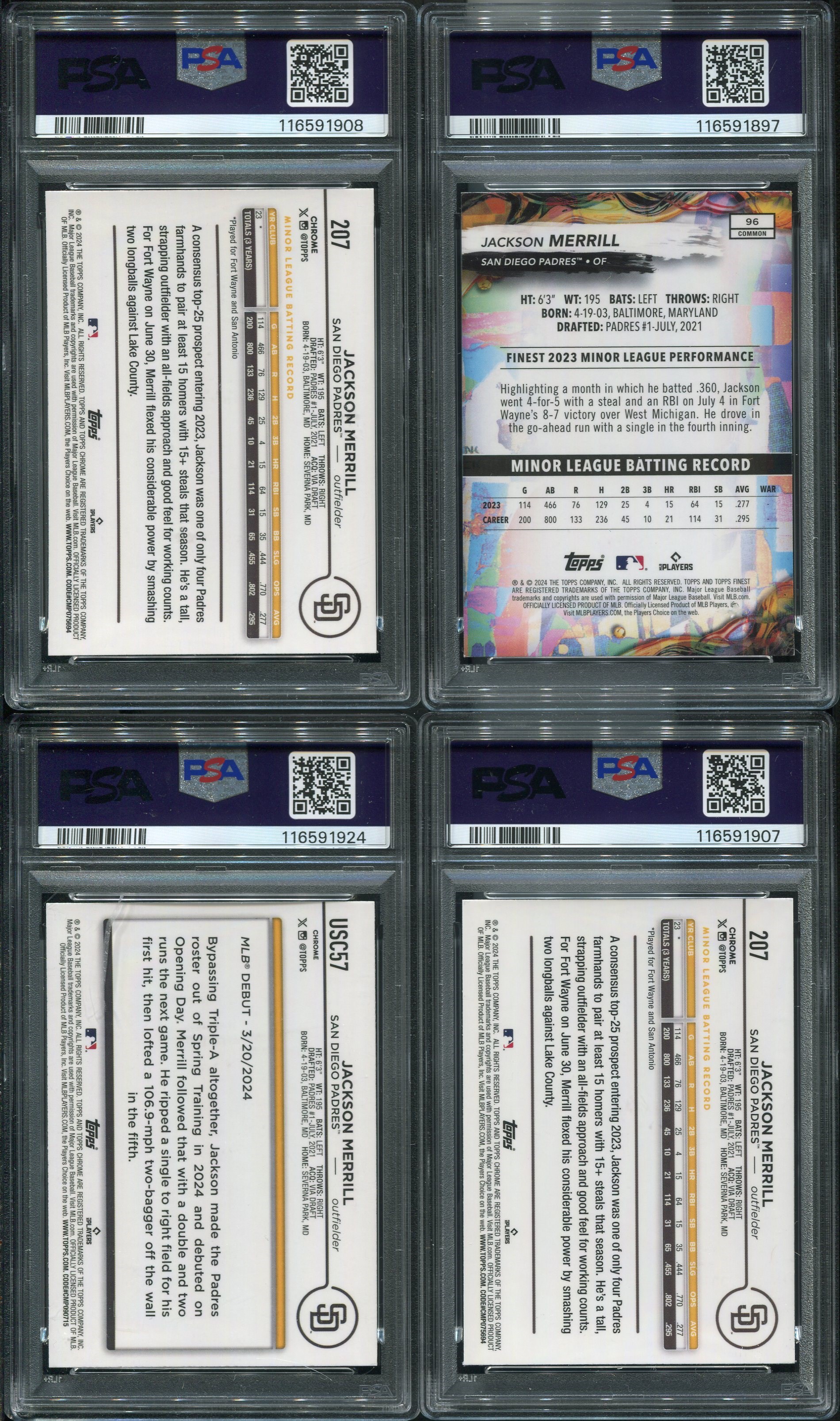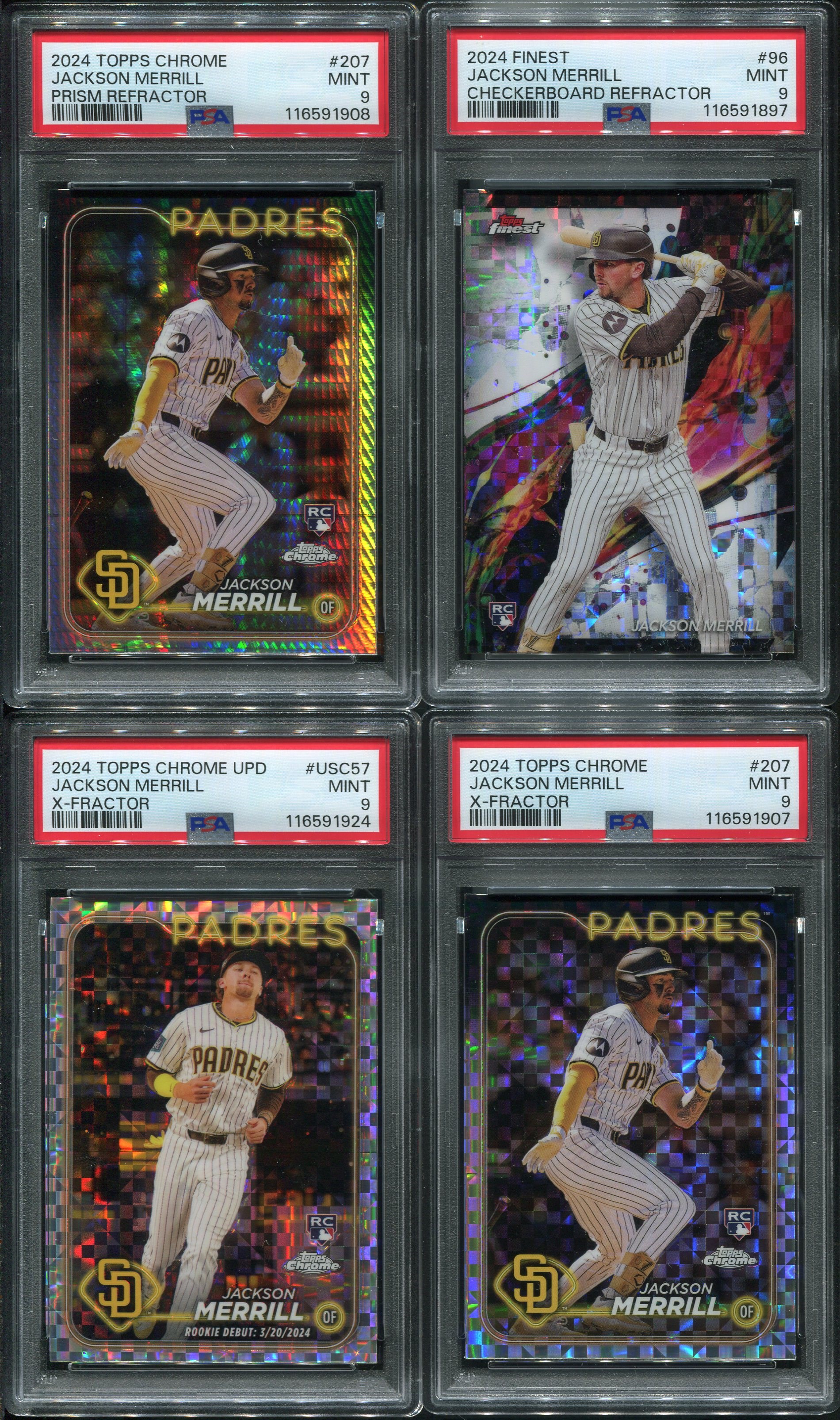 Jackson Merrill Lot of 4 Different 2024 Rookie Refractors all PSA Mint 9's - Lot includes his 2024 Topps Chrome Prizm Refractor, 2024 Topps Chrome X-Fractor, 2024 Topps Chrome Update X-fractor and his 2024 Finest Checkerboard Refractor. A great opportunity to add four graded rookie cards to your collection.