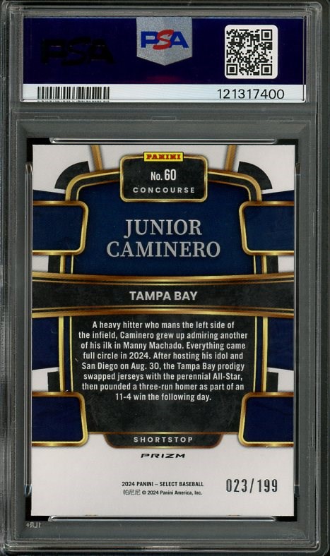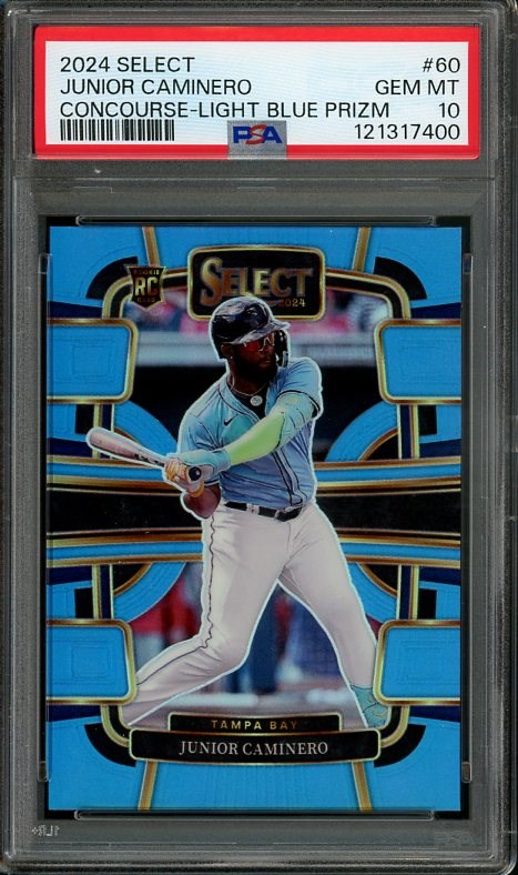 2024 Panini Select Junior Caminero Light Blue Prizm RC #60  #'d/199  PSA Gem Mint 10 (Pop 2) - Caminero has a lot of upside potential.  Here is a great, low pop card in PSA 10 grade.