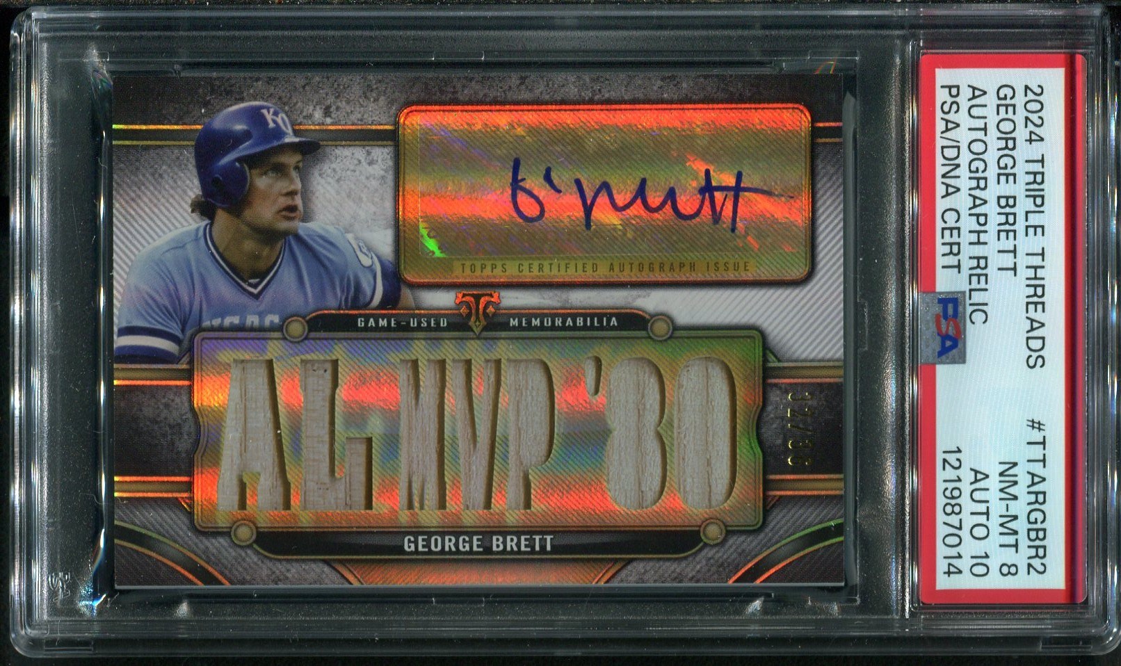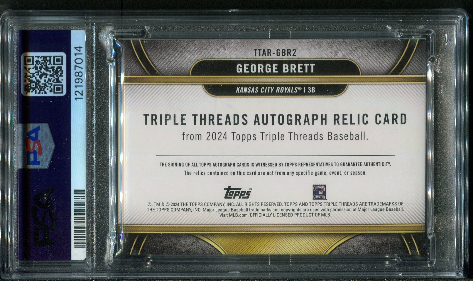 2024 Topps Triple Threads George Brett 7 Piece Game Used Relic Autograph #'d/36 PSA 8 with PSA 10 Auto - Here is a high end Brett autograph to add to your collection. Multiple relics, a NM/MT card and a Gem Mint signature. Don't miss out on this one!