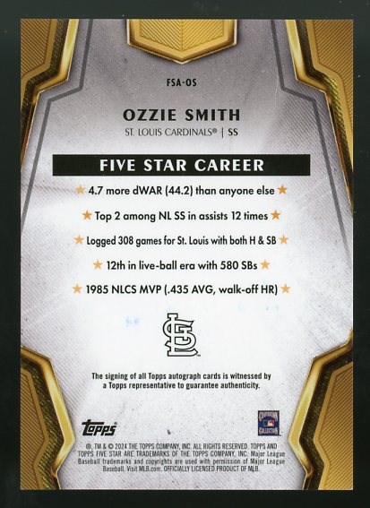 2024 Topps Five Star Ozzie Smith Certified Autographs #FSA-OS - A great on card signature by Smith with the card in NM/MT or better condition.