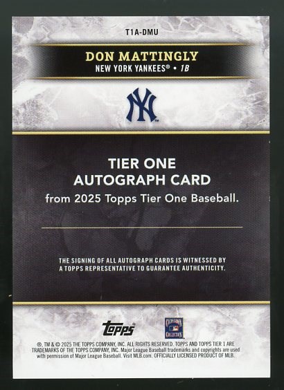 Lot # 374: 2025 Topps Tier One Don Mattingly Certified Autograph #'d/75