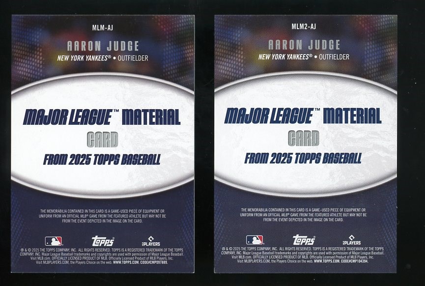 Lot # 378: 2025 Topps Aaron Judge Major League Material Jersey Lot of 2 #MLM-AJ and #MLM2-AJ