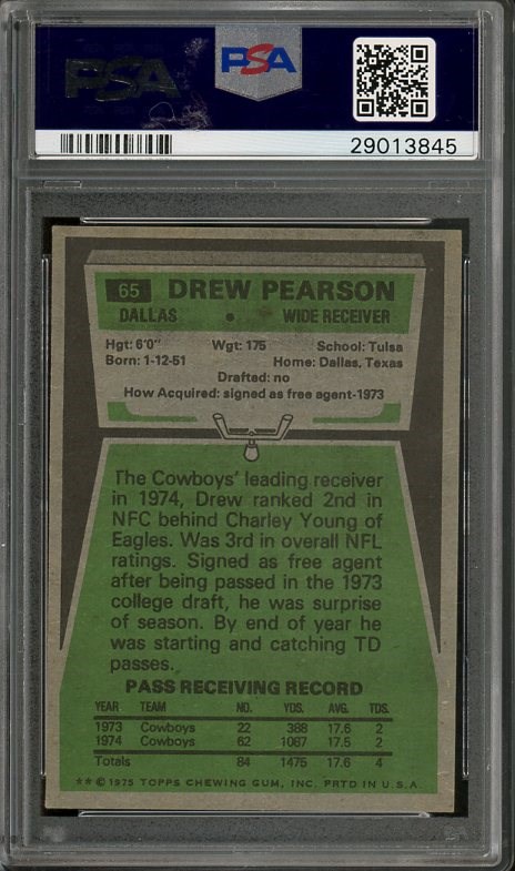 1975 Topps Drew Pearson RC #65  PSA NM/MT 8 - Elected to the Hall of Fame in 2021, Pearson played a key role in the success of the Cowboys offense.