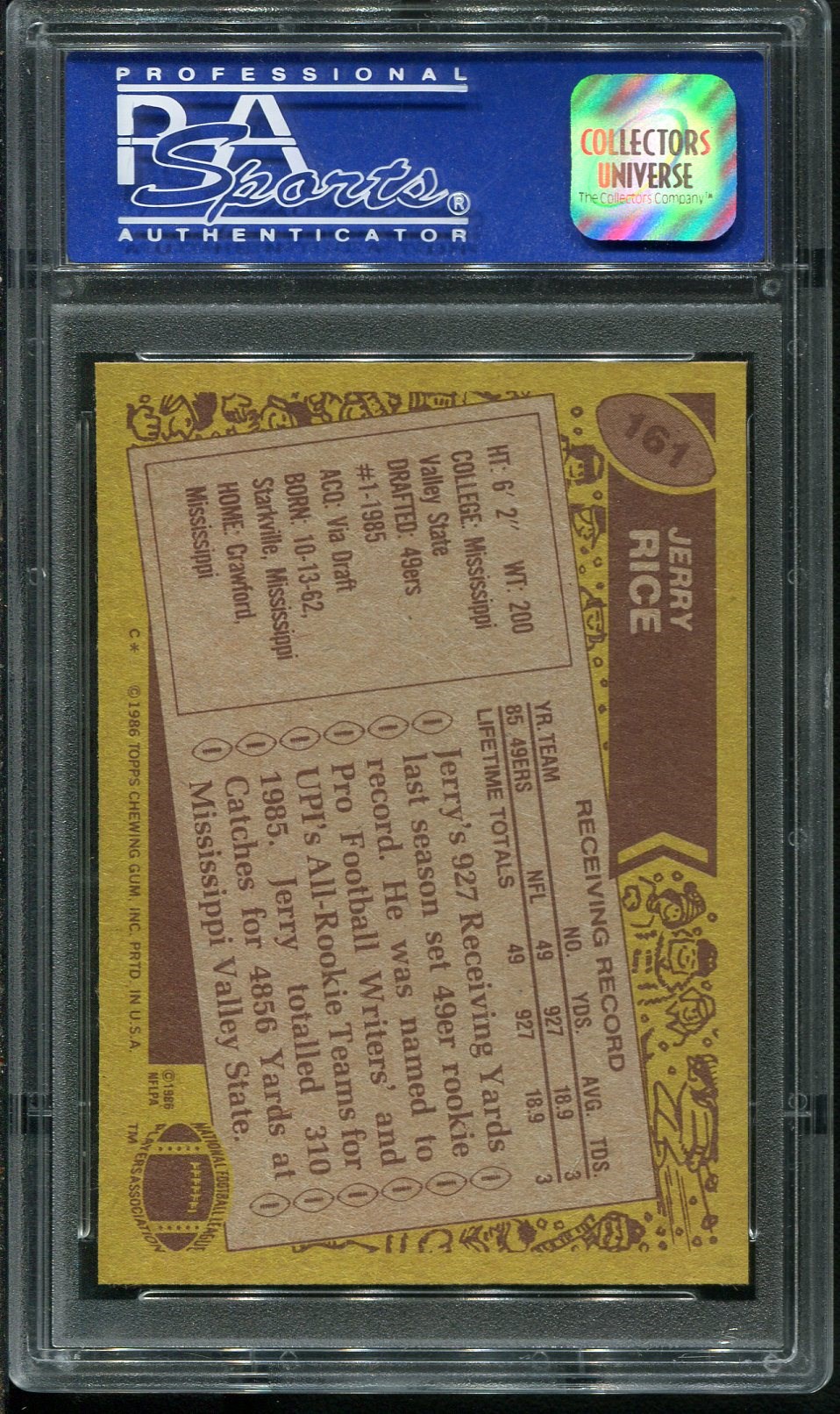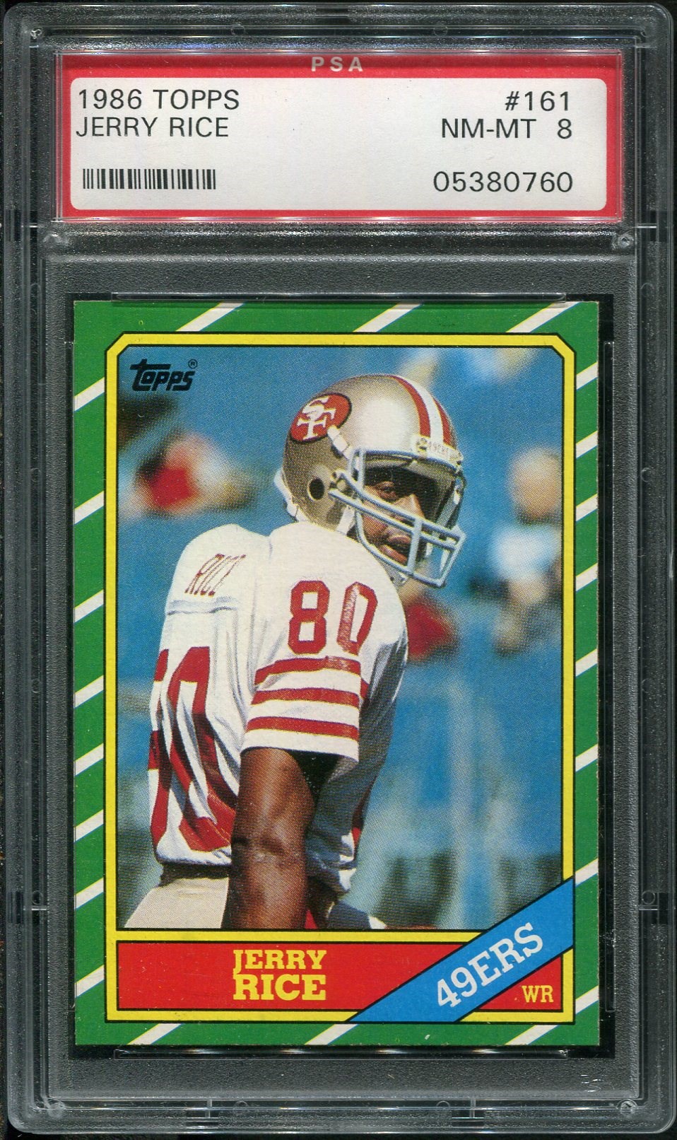 1986 Topps Jerry Rice RC #161  PSA NM/MT 8 - Card and holder are problem free.  Rice became a Hall of Famer in 2010 and is known as the GOAT of wide receivers.