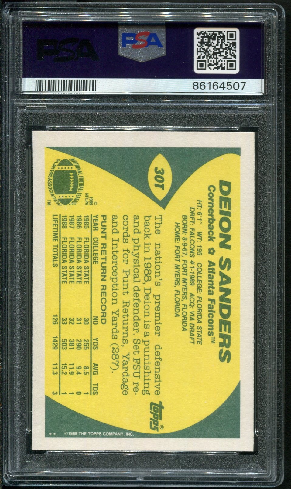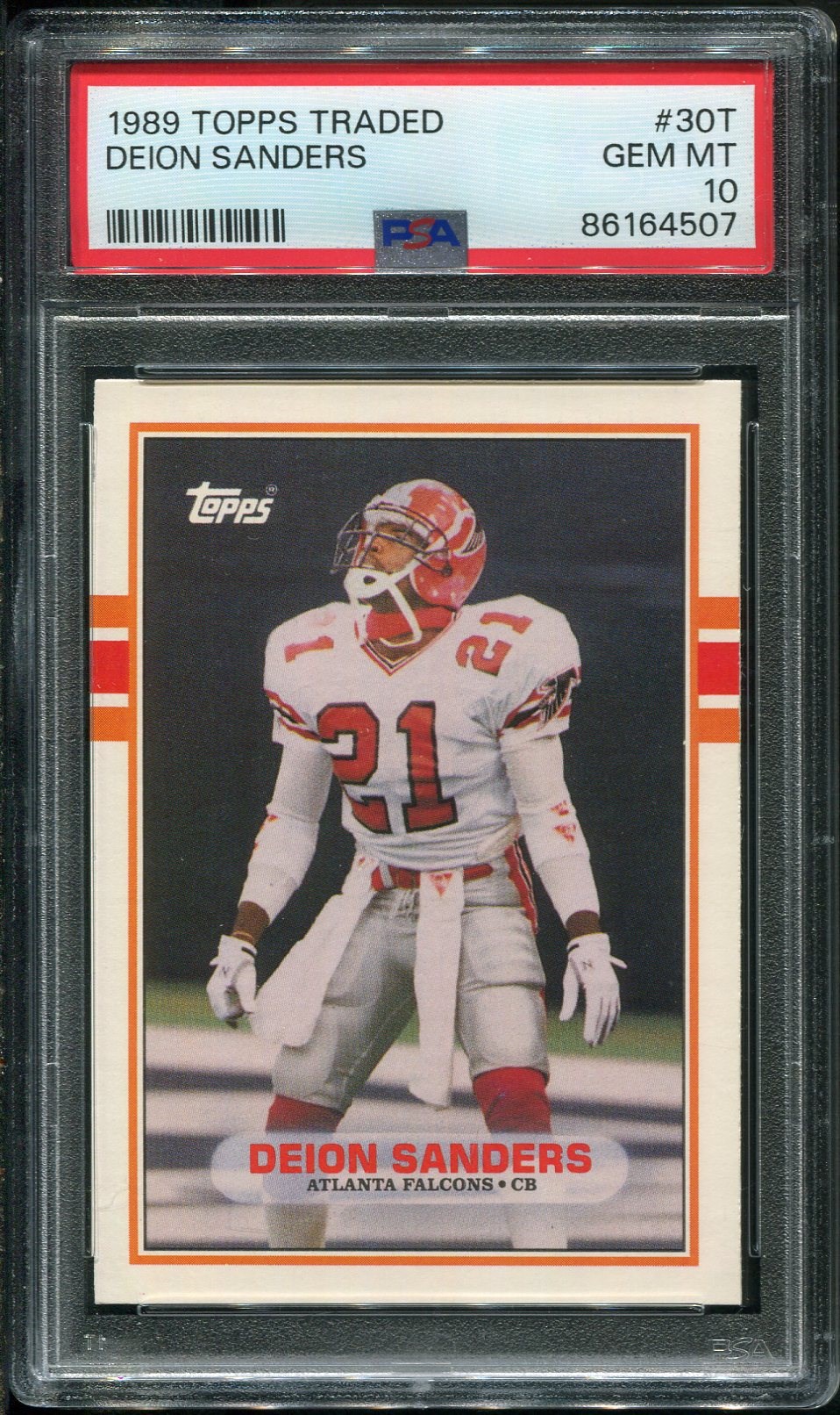 1989 Topps Traded Deion Sanders RC #30T PSA Gem Mint 10 - Here is the football rookie card of Sanders from the 1989 Topps Traded set. Card comes in a scratch free PSA holder.