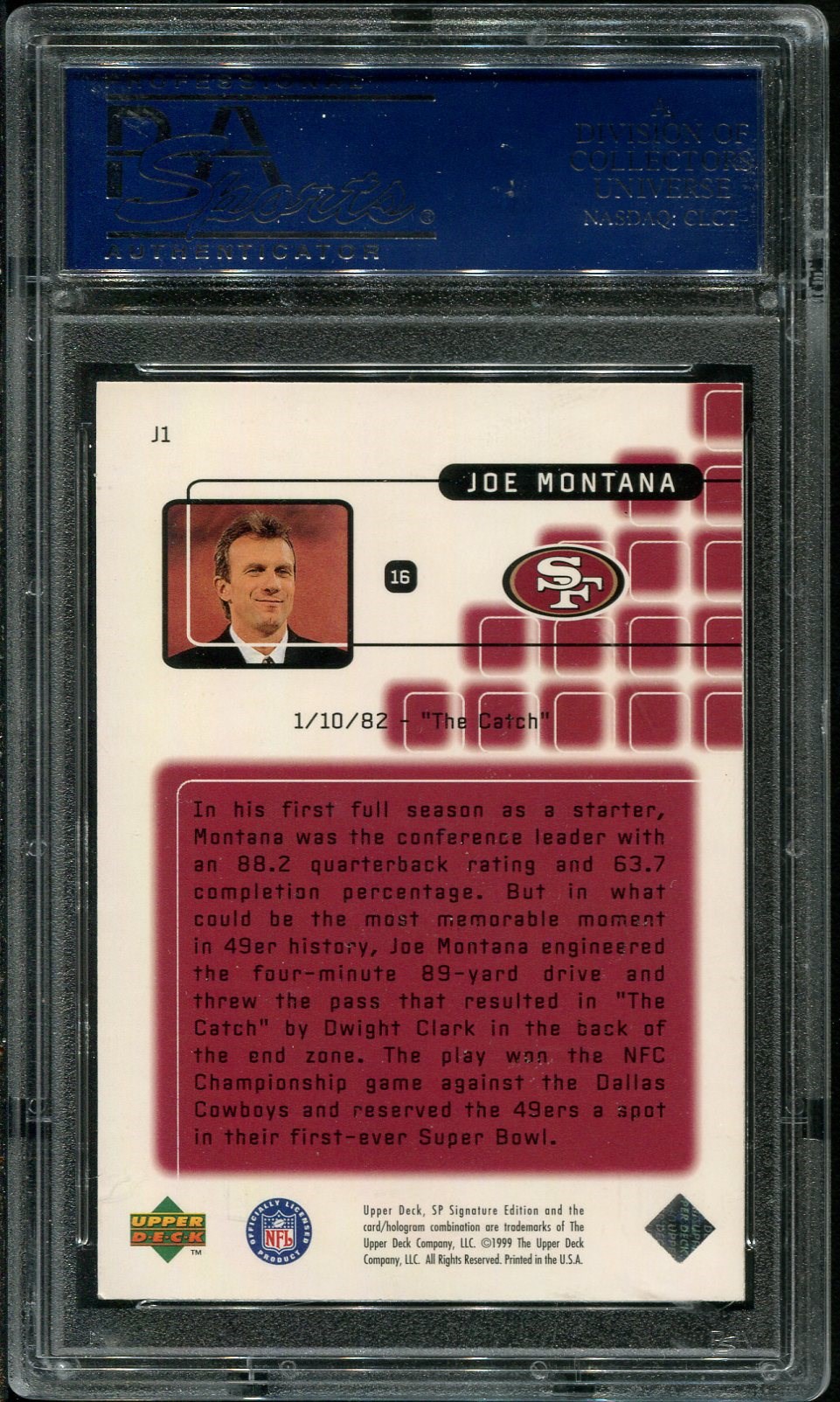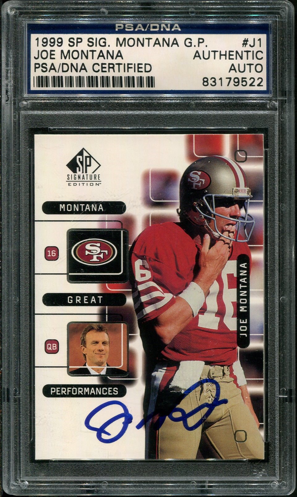 1999 SP Signature Joe Montana Great Performance Autograph #J1 PSA/DNA Authentic - Card features Montana in 49ers uniform and has an on card autograph certified by Upper Deck and PSA as well.