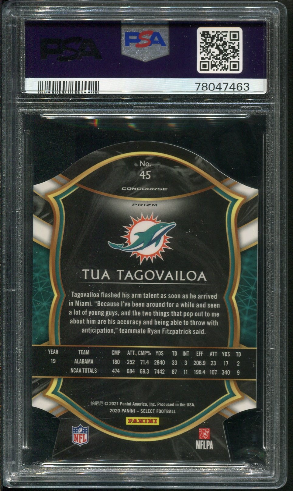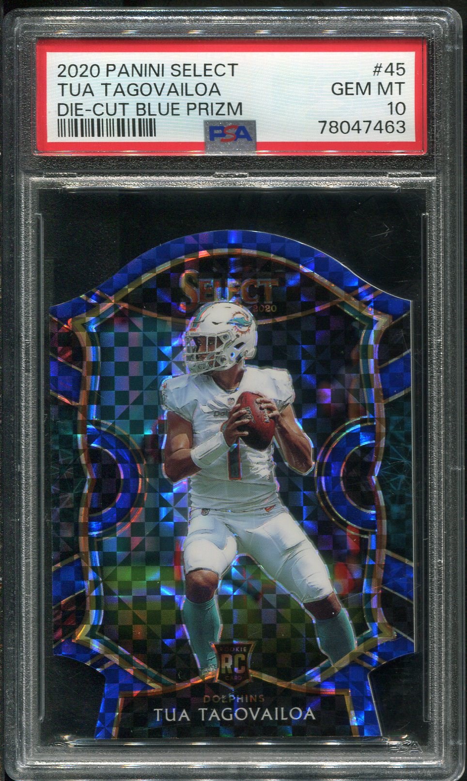 2020 Panini Select Tua Tagovailoa Blue Prizm Die-Cut RC #45 PSA Gem Mint 10 - After a slow start in 2025, Tua and the Dolphins turned the second half of the season around. Here is a tough parallel rookie of Tua in PSA Gem Mint 10 grade.
