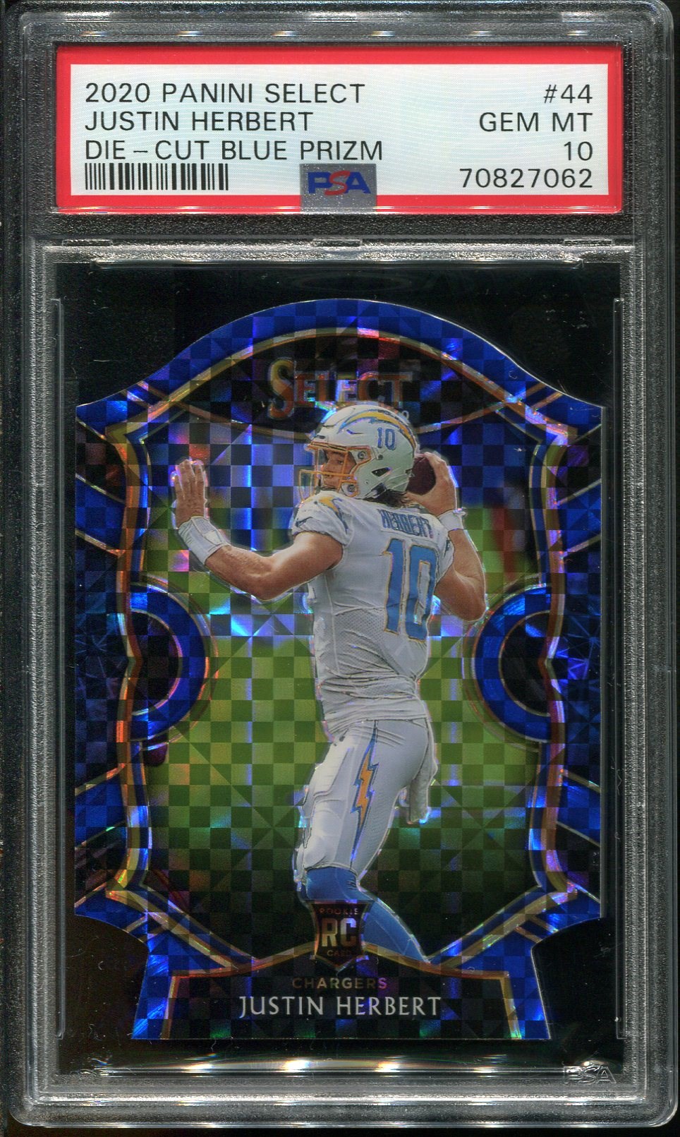 2020 Panini Select Justin Herbert Blue Prizm Die-Cut RC #44 PSA Gem Mint 10 - Here is one of Herbert's more attractive rookie cards. Card has been graded Gem Mint 10 by PSA and comes in a scratch free PSA holder.